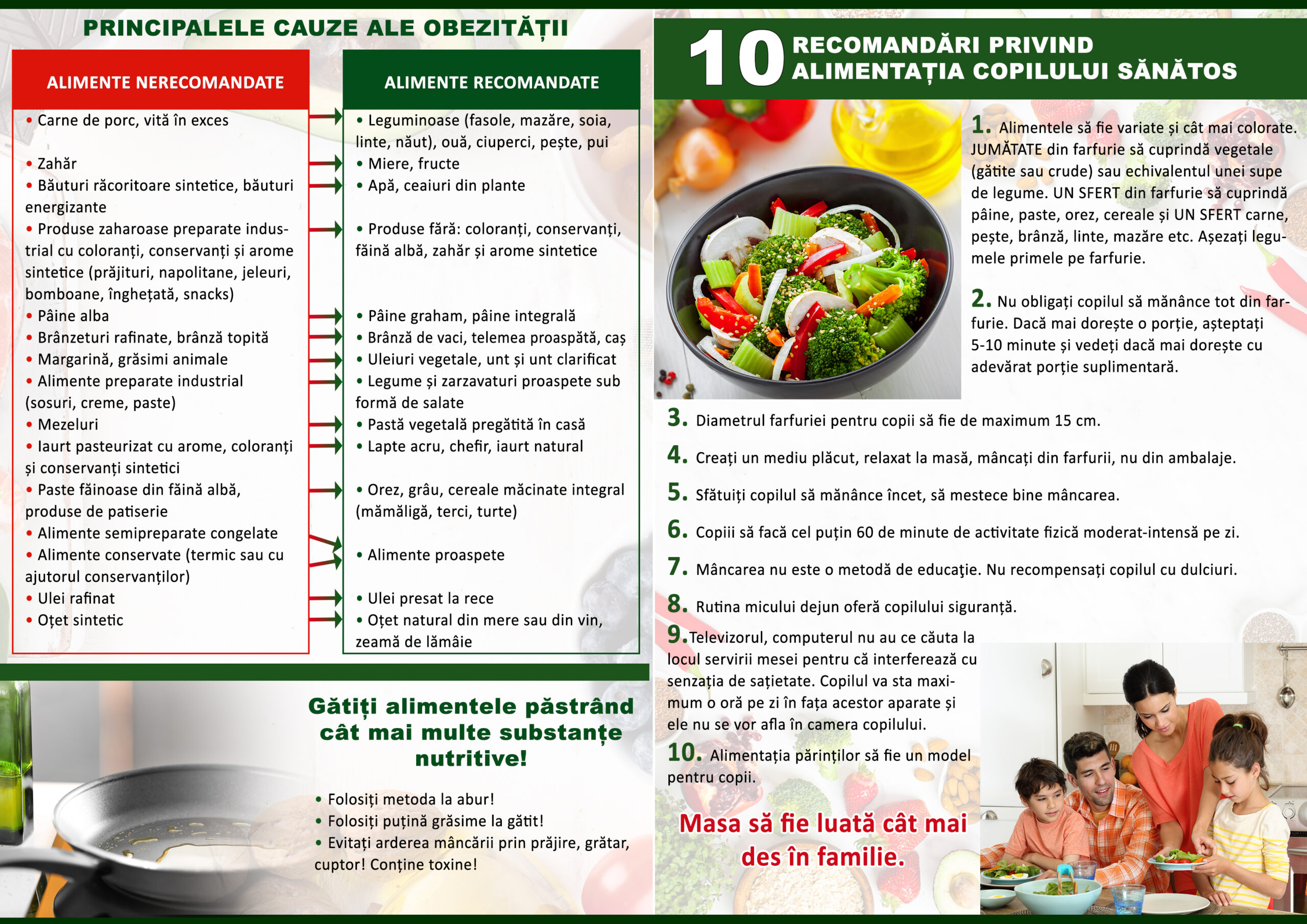 O alimentație bogată în legume și fructe, consum de cereale integrale, înlocuirea prăjiturilor cu fructe, consumul de apă, nu de alte băuturi îndulcite, limitarea consumului de sare la cel mult jumătate de linguriță pe zi, încurajarea copilului să facă mișcare cel puțin 60 de minute în fiecare zi: toate sunt măsuri de intervenție aflate la îndemâna părinților pentru a preveni problemele de supraponderalitate și obezitate.