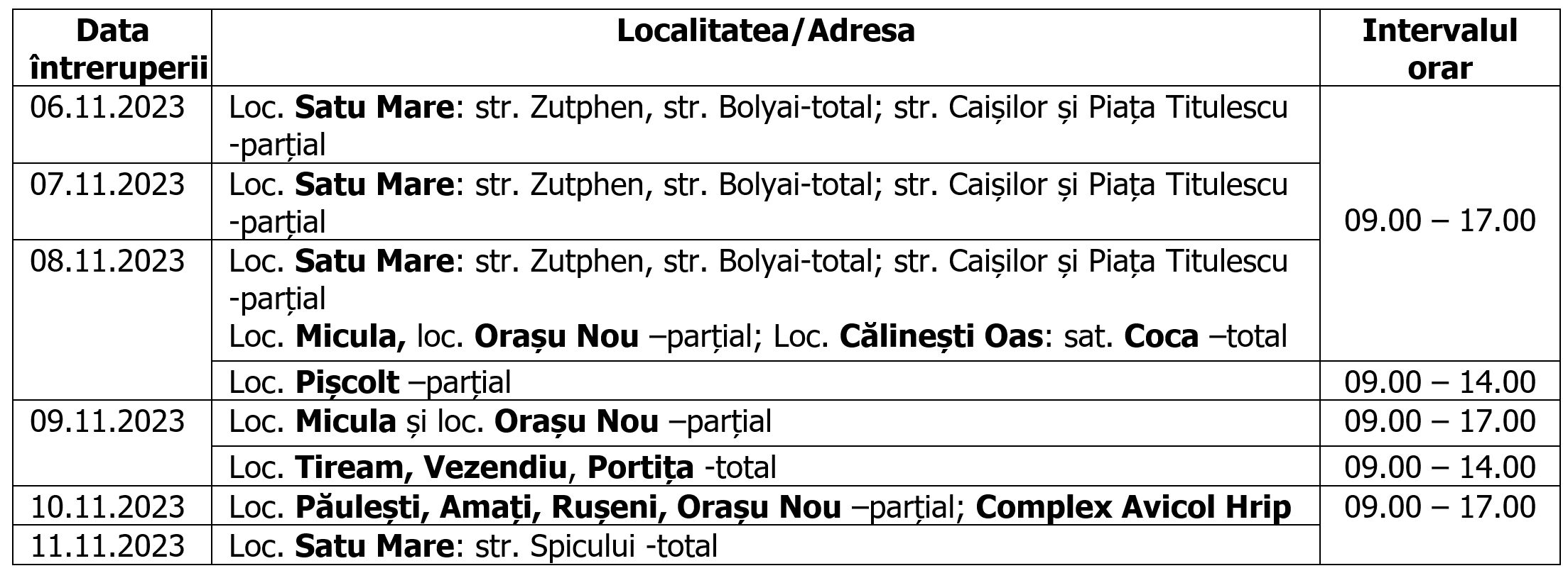 Informaţii actualizate despre întreruperile planificate și neplanificate în alimentarea cu energie electrică sunt disponibile pe site-ul www.distributie-energie.ro, rubrica Suport/Întreruperi. Ne cerem scuze pentru neplăcerile cauzate de aceste întreruperi, care sunt însă necesare pentru asigurarea unei bune funcţionări a instalaţiilor. Relații suplimentare la telefon 0261 929 sau telverde 0800 400 929.