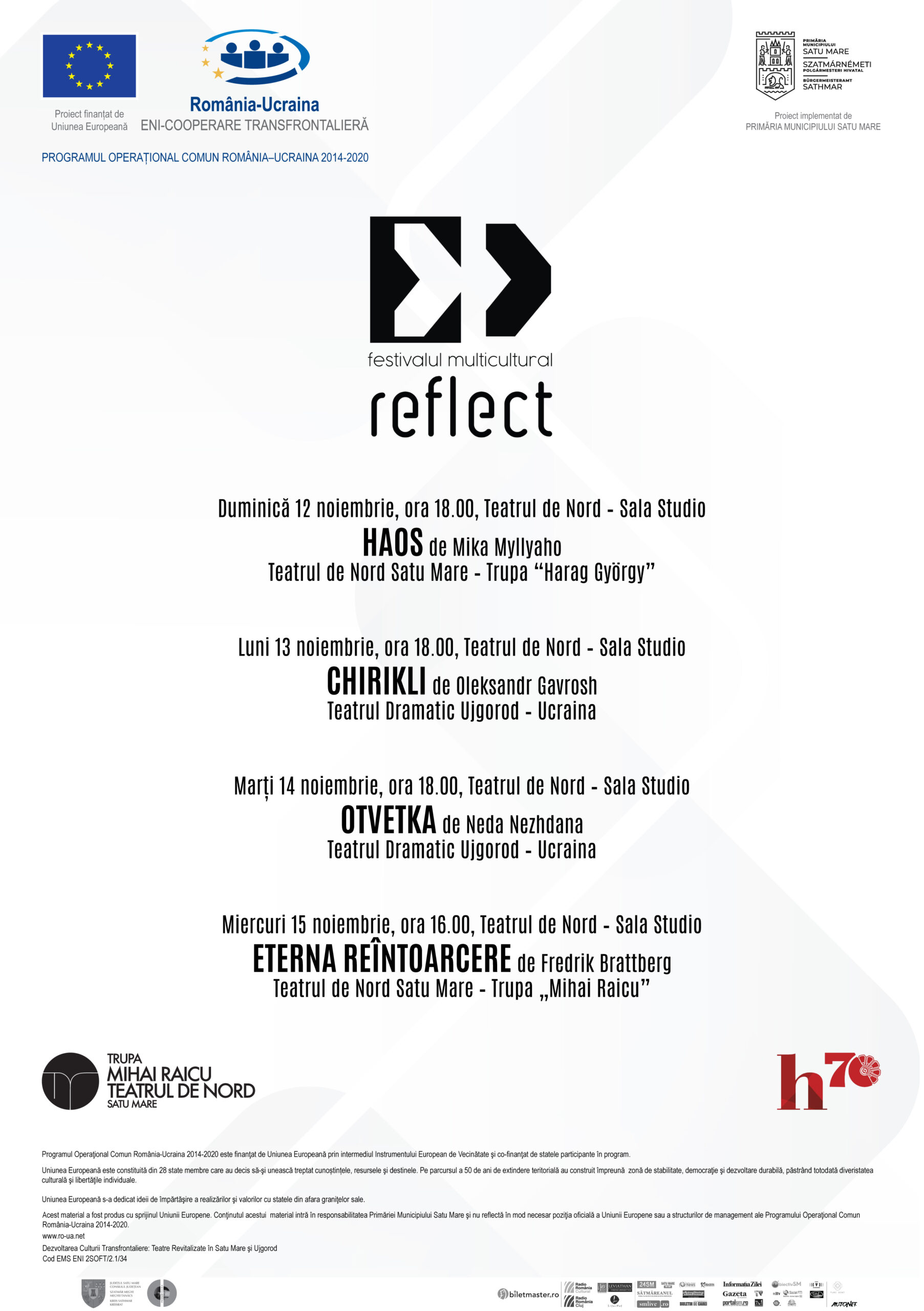 Municipiul Satu Mare, în parteneriat cu Teatrul Ucrainean Regional Dramatic din Regiunea Transcarpatia şi Consiliul Local Ujgorod, implementează proiectul cu titlul „Dezvoltarea Culturii Transfrontaliere: Teatre Revitalizate în Satu Mare şi Ujgorod (Developing cross-border culture: Revitalised Theatres in Satu Mare and Uzhgorod)", cod EMS: ENI 2SOFT/2.1/34.