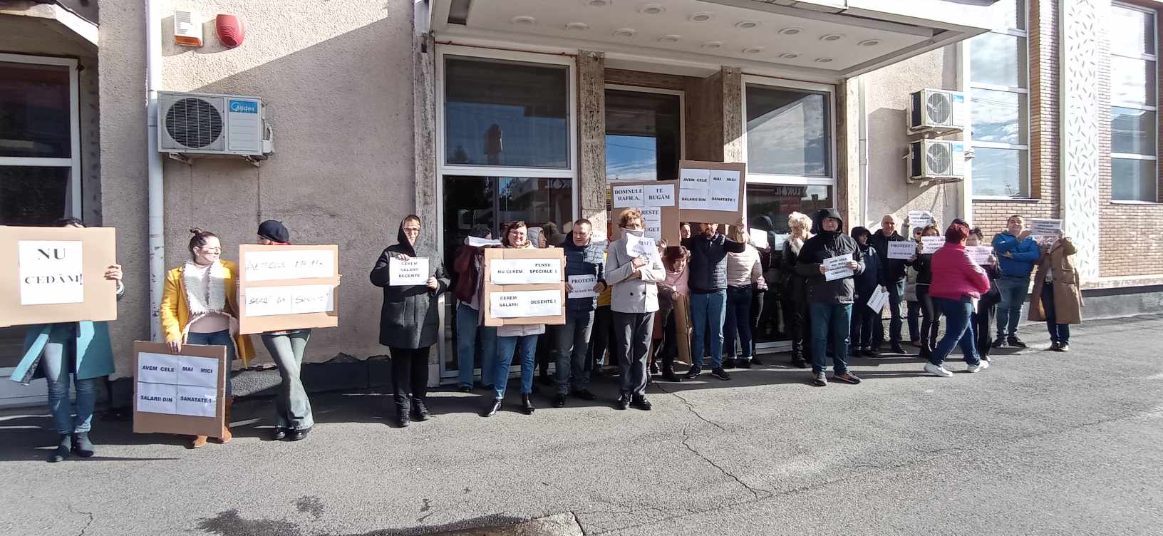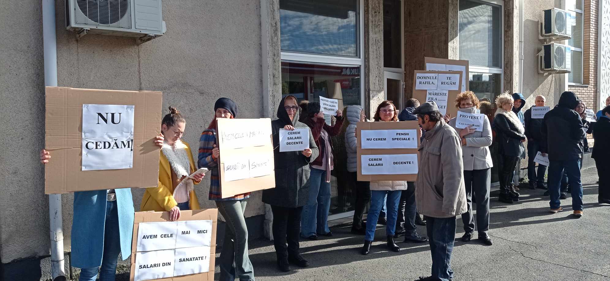Angajații Casei Județene de Asigurări de Sănătate Satu Mare au ieșit astăzi în stradă, în fața instituției, protestând timp de o oră „împotriva politicii de dispreț a guvernului și parlamentului la adresa acestor salariați”.