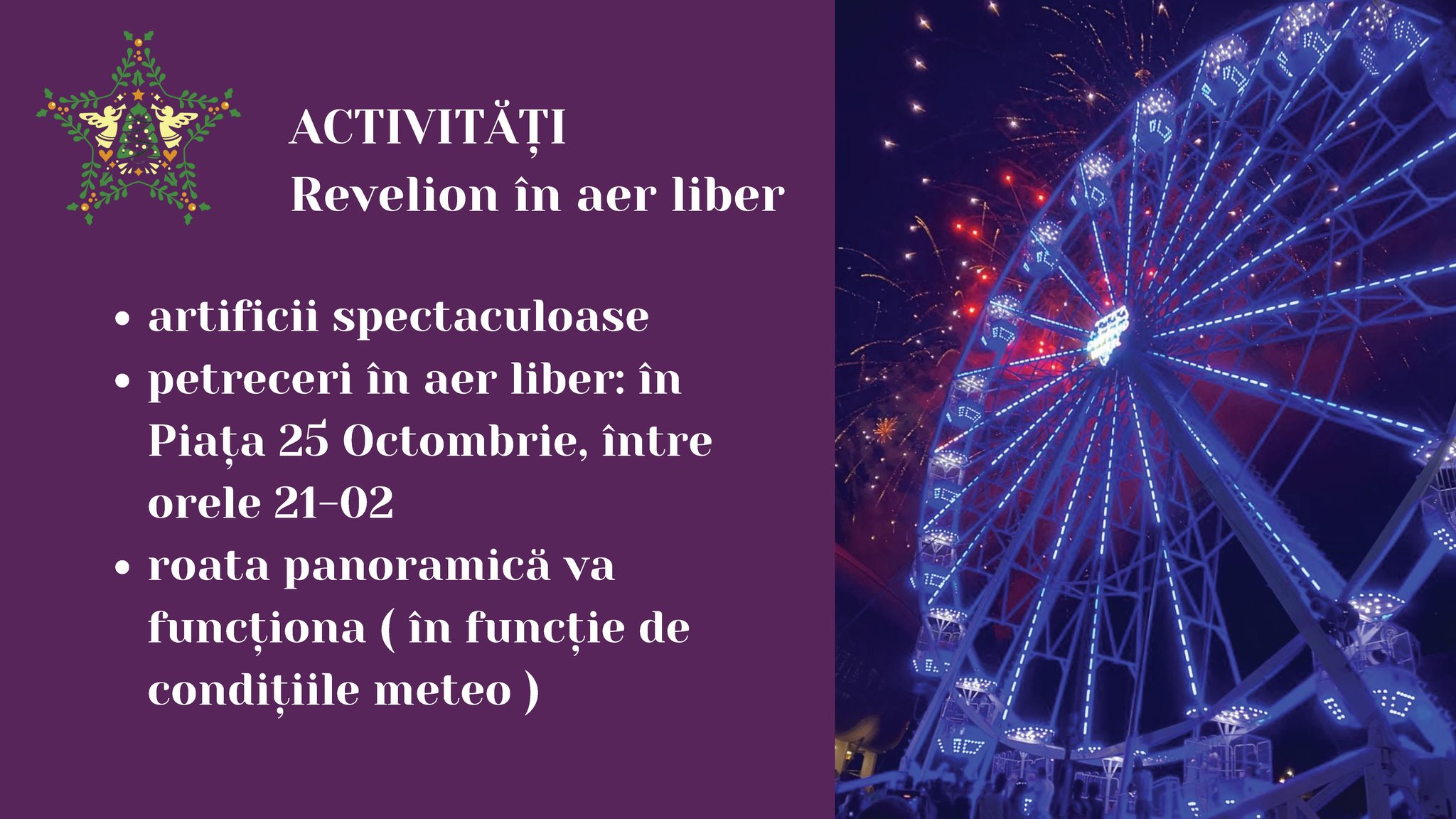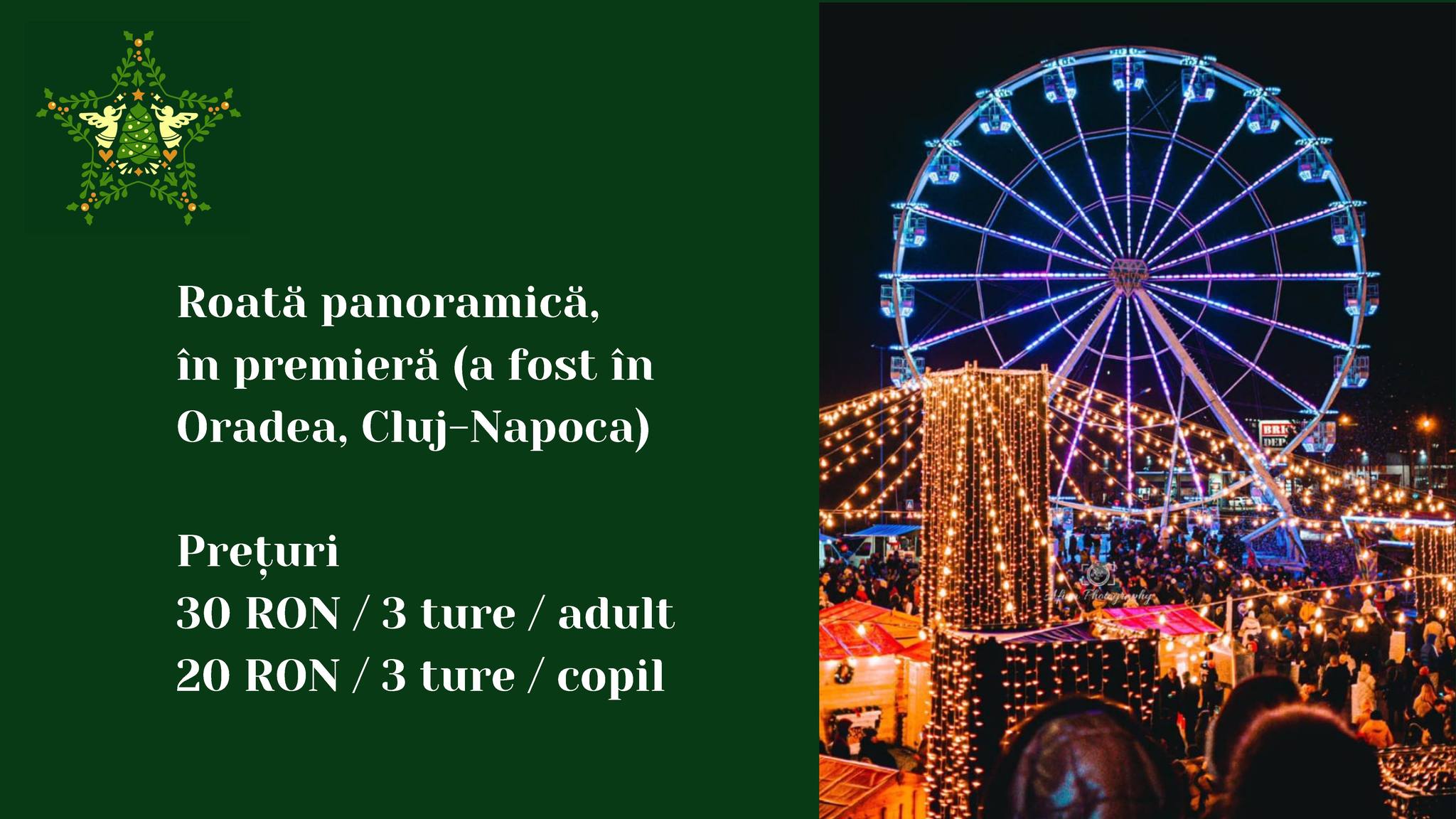 Anul acesta, în premieră, aducem în Piața 25 Octombrie o nouă surpriză pentru sătmăreni: o roată panoramică spectaculoasă, care va reprezenta cu siguranță un punct de atracție pentru toți cei care vor să aibă de o experiență inedită.