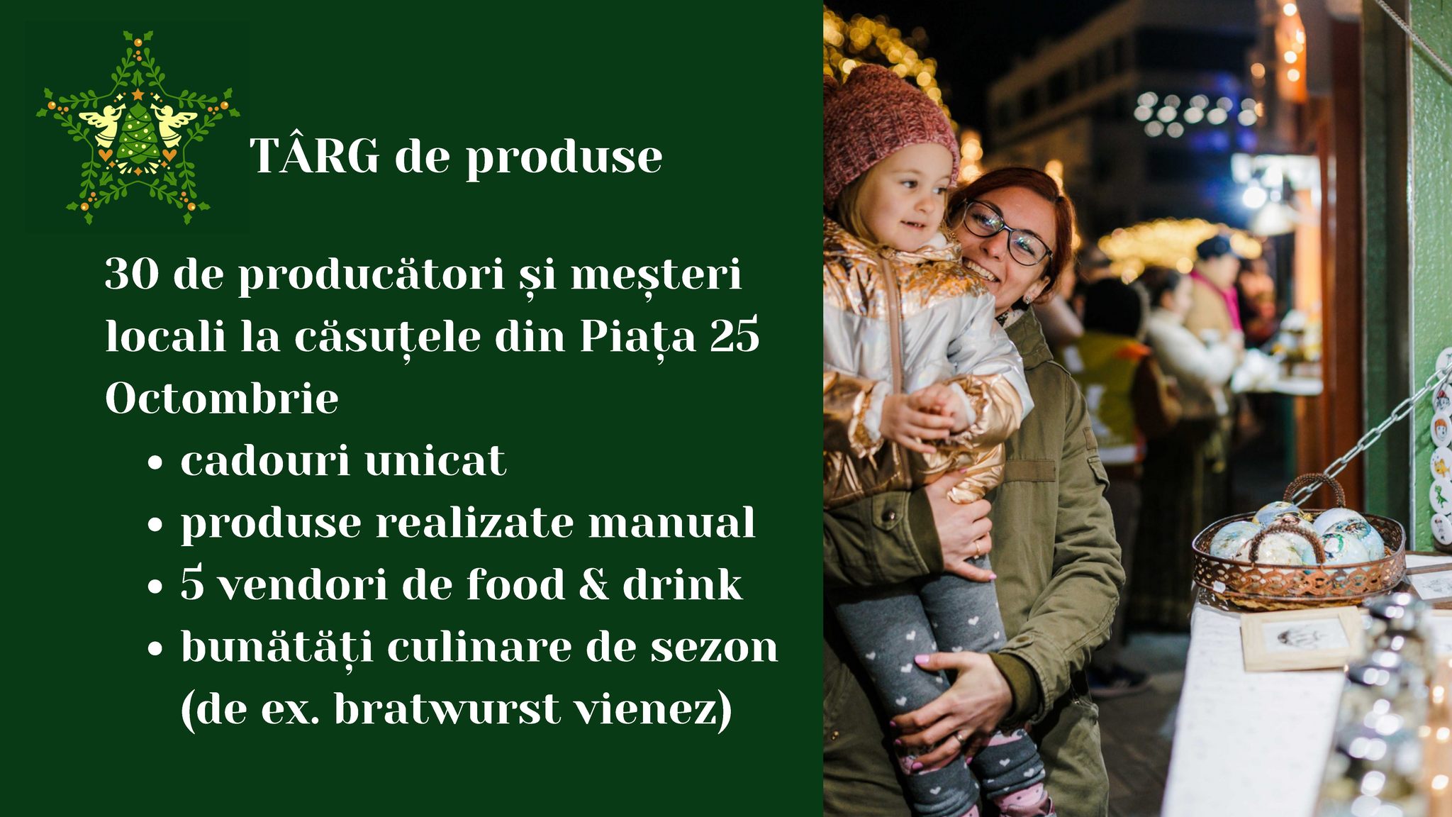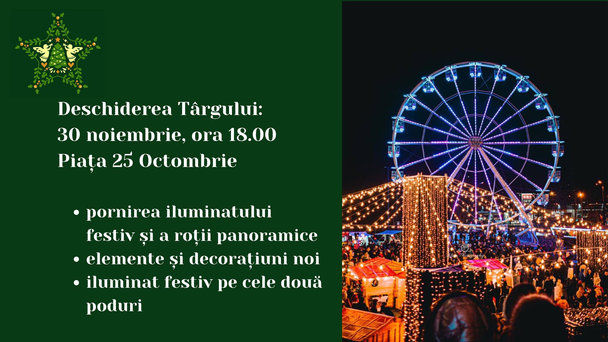 Atmosfera magică a Crăciunului se va simți în perioada 30 noiembrie - 3 ianuarie la Târgul de Crăciun din Piața 25 Octombrie. Și în acest an, sub cupola de lumini, printre miile de luminițe ale decorațiunilor de sărbătoare, lângă bradul frumos împodobit, ne vom bucura împreună de cea mai frumoasă perioadă din an, de Crăciunul în familie. În jurul celui ce e simbol al sărbătorilor de iarnă, bradul, ne vom întâlni cu toții pentru a primi vestea Nașterii Domnului prin glasul cetelor de colindători. O altă mare surpriză la evenimentul din acest an este că vom colinda împreună.