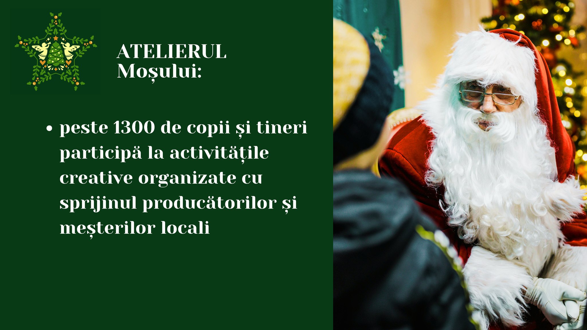 Moș Crăciun îi așteaptă pe cei mai mici vizitatori ai Târgului în căsuța lui magică. Totodată, peste 1300 de copii și tineri se vor bucura anul acesta în cadrul Târgului de Crăciun de magia sărbătorilor de iarnă în Atelierul Moșului. Meșteri populari și producători locali devin pe perioada Târgului spiriduși ai lui Moș Crăciun pentru a-i ajuta pe copii să descopere tainele confecționării decorațiunilor specifice sărbătorilor de iarnă, ale picturii pe lemn, pe sticlă, fascinanta poveste a croitoriei, drumul ceramicii, producerea ceaiului și multe altele. Toți copiii care participă la Atelierul Moșului vor primi în dar câte un suvenir care să le amintească din plăcuta experiență din atelier.