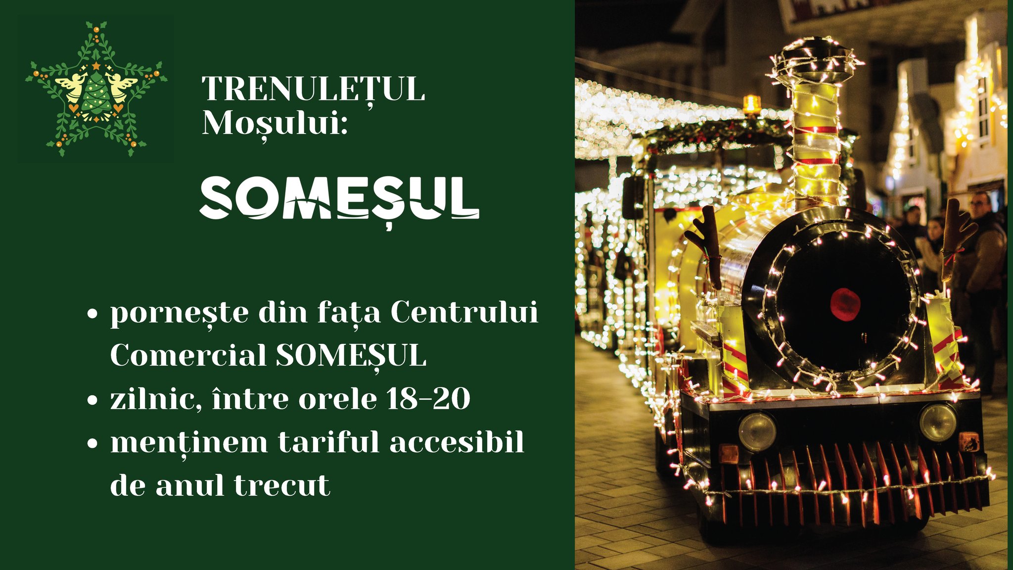 Cei care doresc să facă turul Târgului de Crăciun sunt invitați să profite și anul acesta de Trenulețul Moșului care va porni la fel ca și anul trecut dintr-un punct fix, fiind pregătit să îi bucure atât pe cei mici, cât și pe cei mari.