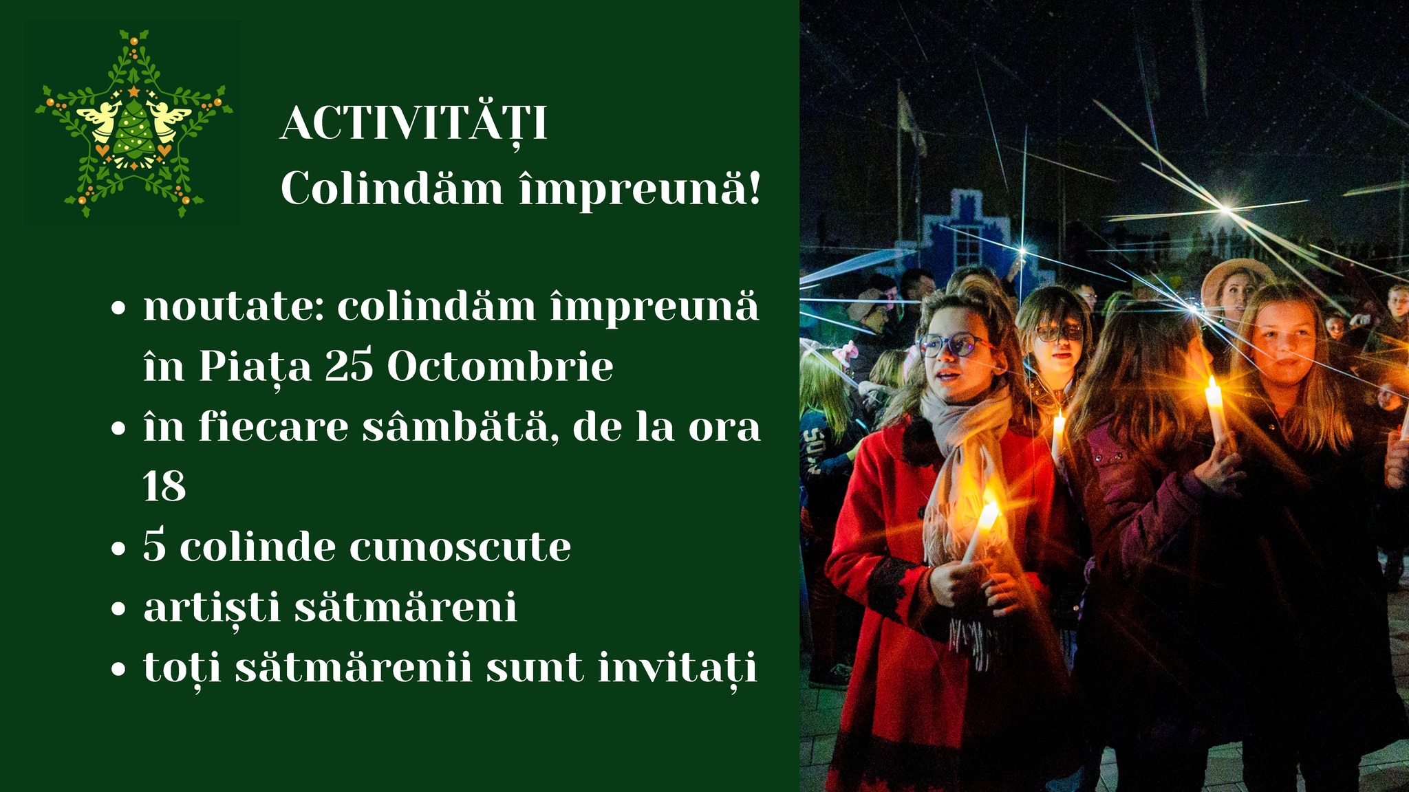 Astfel, în 2 decembrie de la ora 18.00, sătmărenii cu mic cu mare sunt invitați în jurul bradului pentru a interpreta împreună cele mai frumoase colinde în limba română, iar în 9 decembrie, de la aceeași oră interpretăm împreună colinde în limba maghiară.
