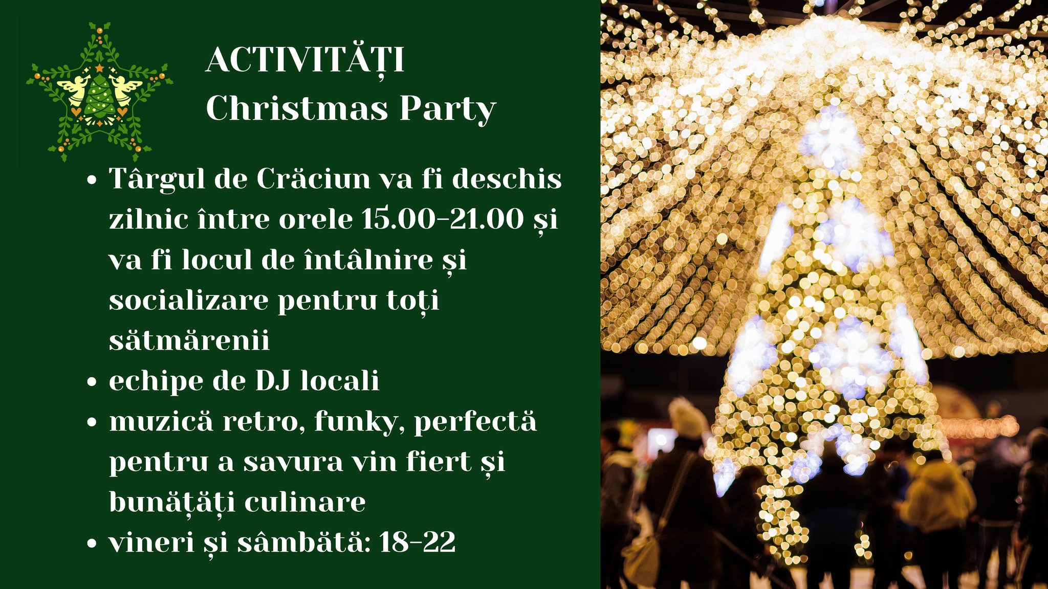 Târgul de Crăciun Satu Mare va fi deschis zilnic între orele 15:00 - 21:00.