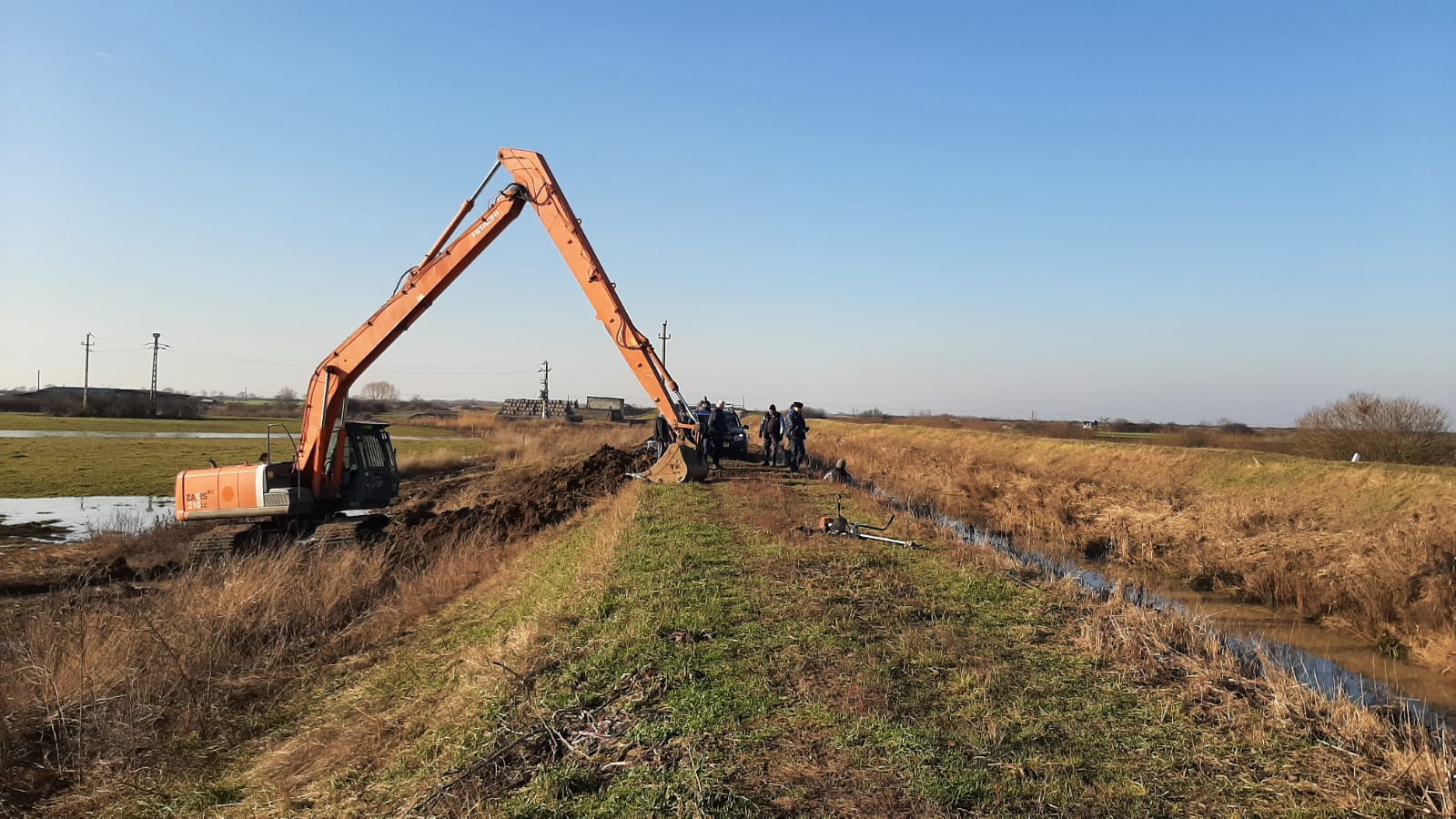 Angajații Sistemului de Gospodărire a Apelor (SGA) Satu Mare intervin pentru închiderea unei breșe, produse în corpul digului de pe Valea Maria, în zona localității Giungi, comuna Beltiug.