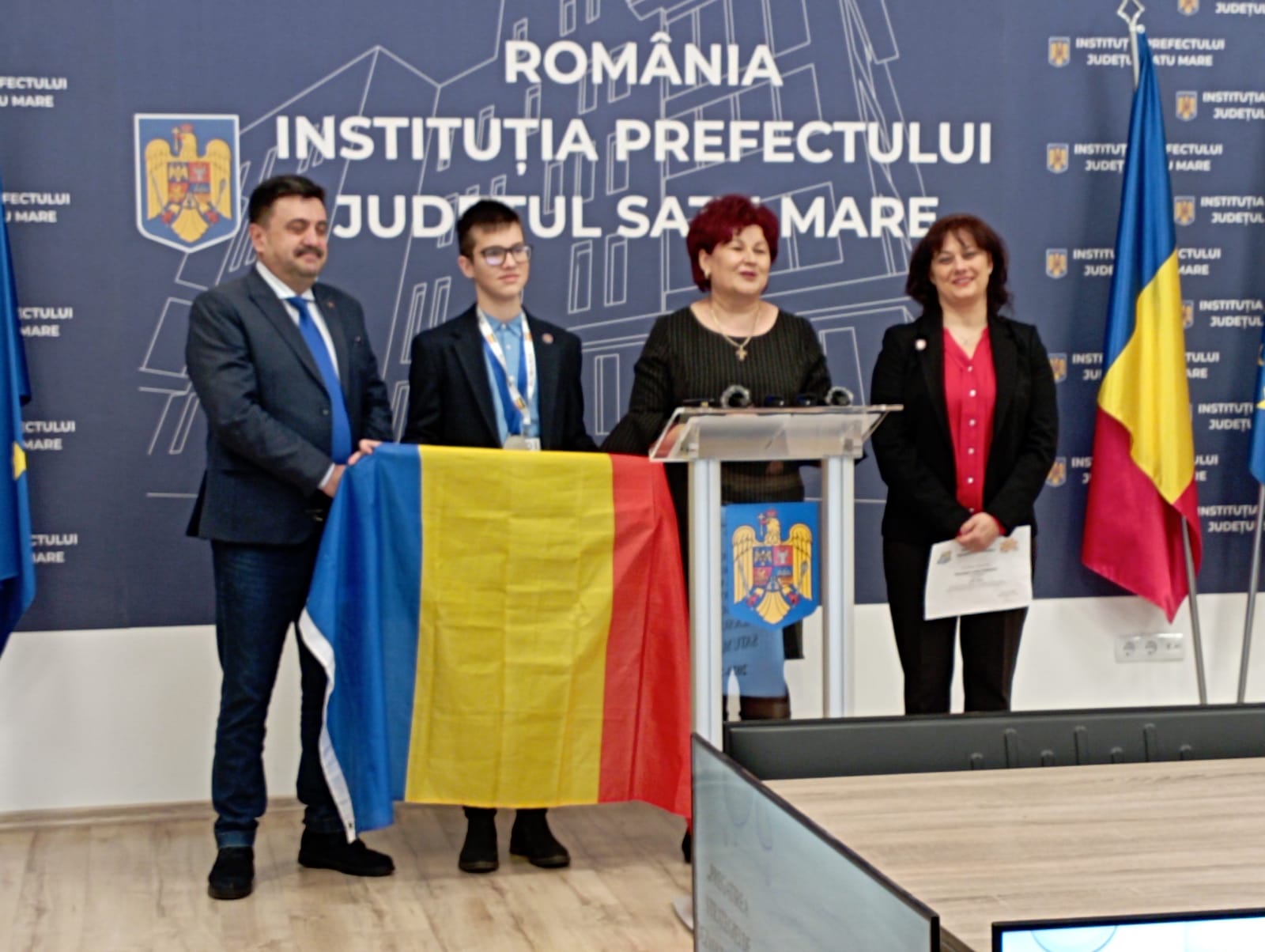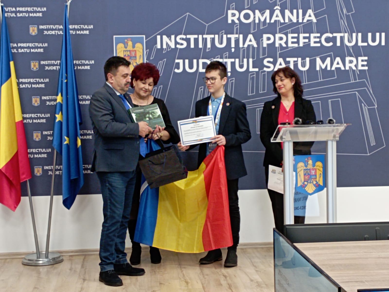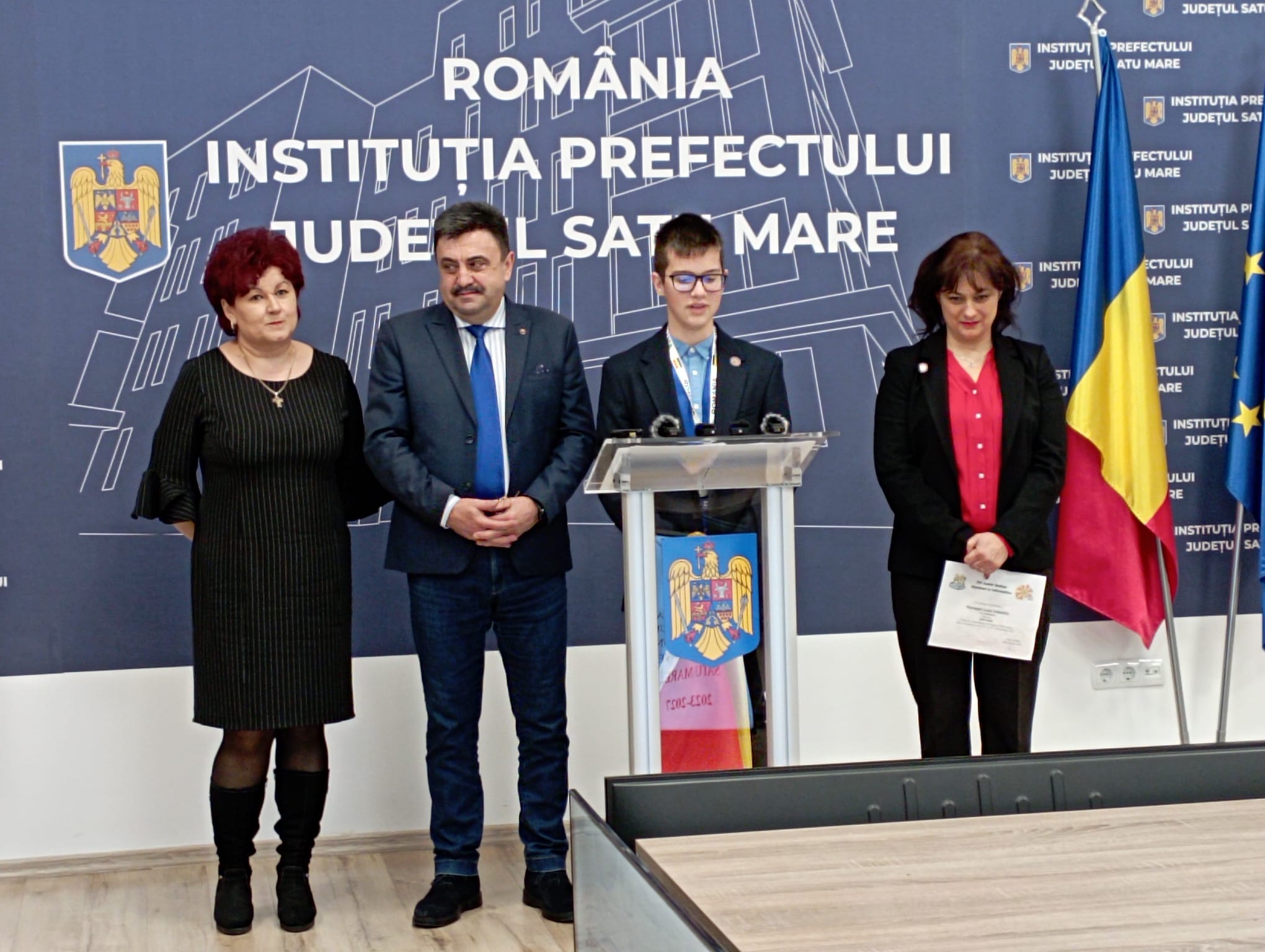 Prefectul Radu Roca a ținut azi să-l felicite și să-i acorde o diplomă de excelență și un premiu, elevului de aur al Sătmarului, olimpicului Luca Mureșan de la Colegiul Național ”Mihai Eminescu” Satu Mare.