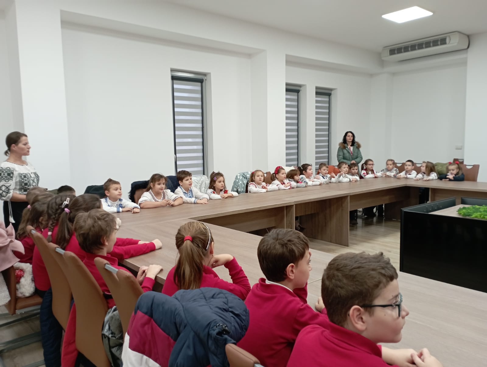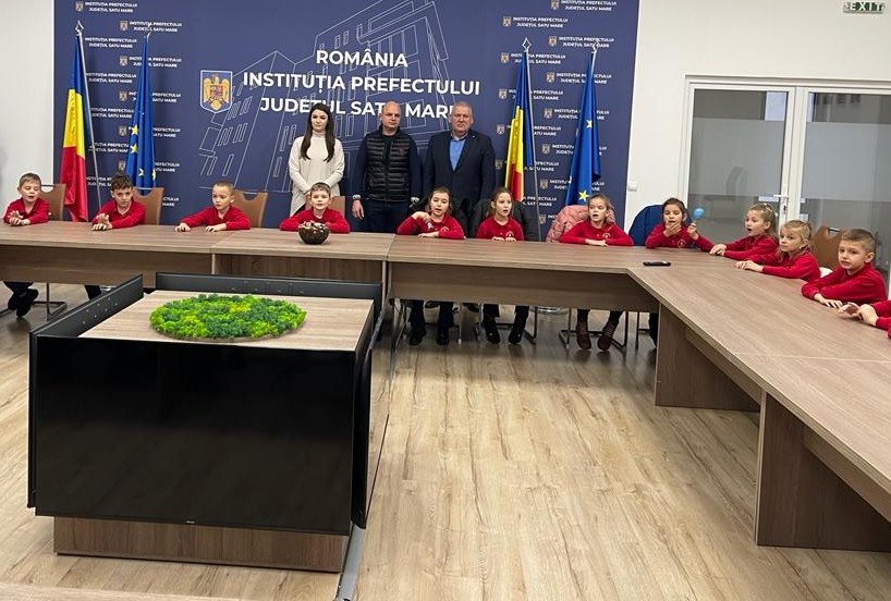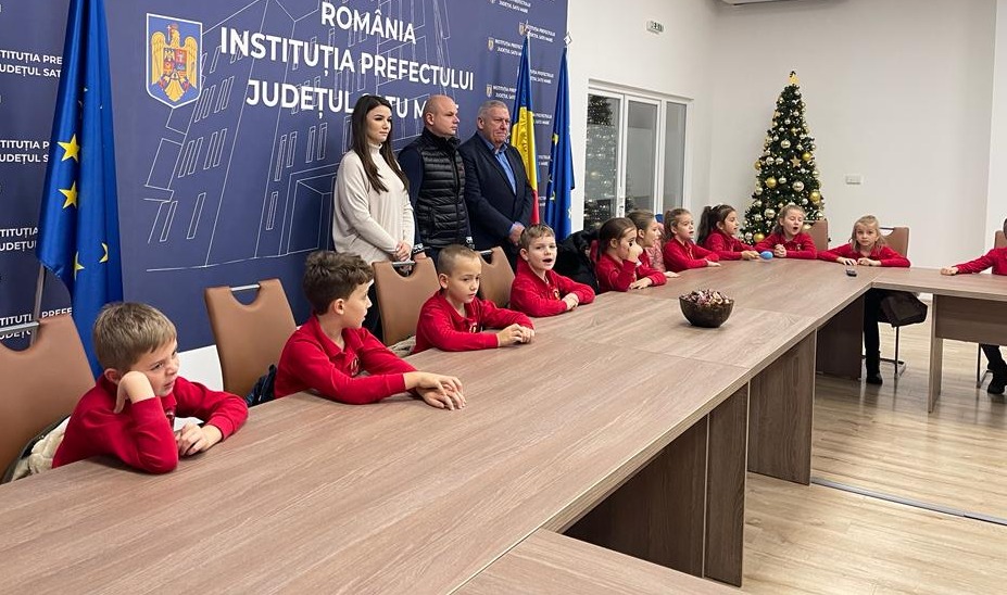 Elevii clasei Pregătitoare A ”step by step” și a clasei a II-a A ”step by step” de la Școala Gimnazială ”Octavian Goga” , îndrumați de doamnele profesoare pentru învățământ primar, Margareta Sucitu și Jakab Emese respectiv Ana Demeter și Anca Nistor au susținut un mini concert de colinde reușind să aducă zâmbete și bucurie în Instituția Prefectului județul Satu Mare.