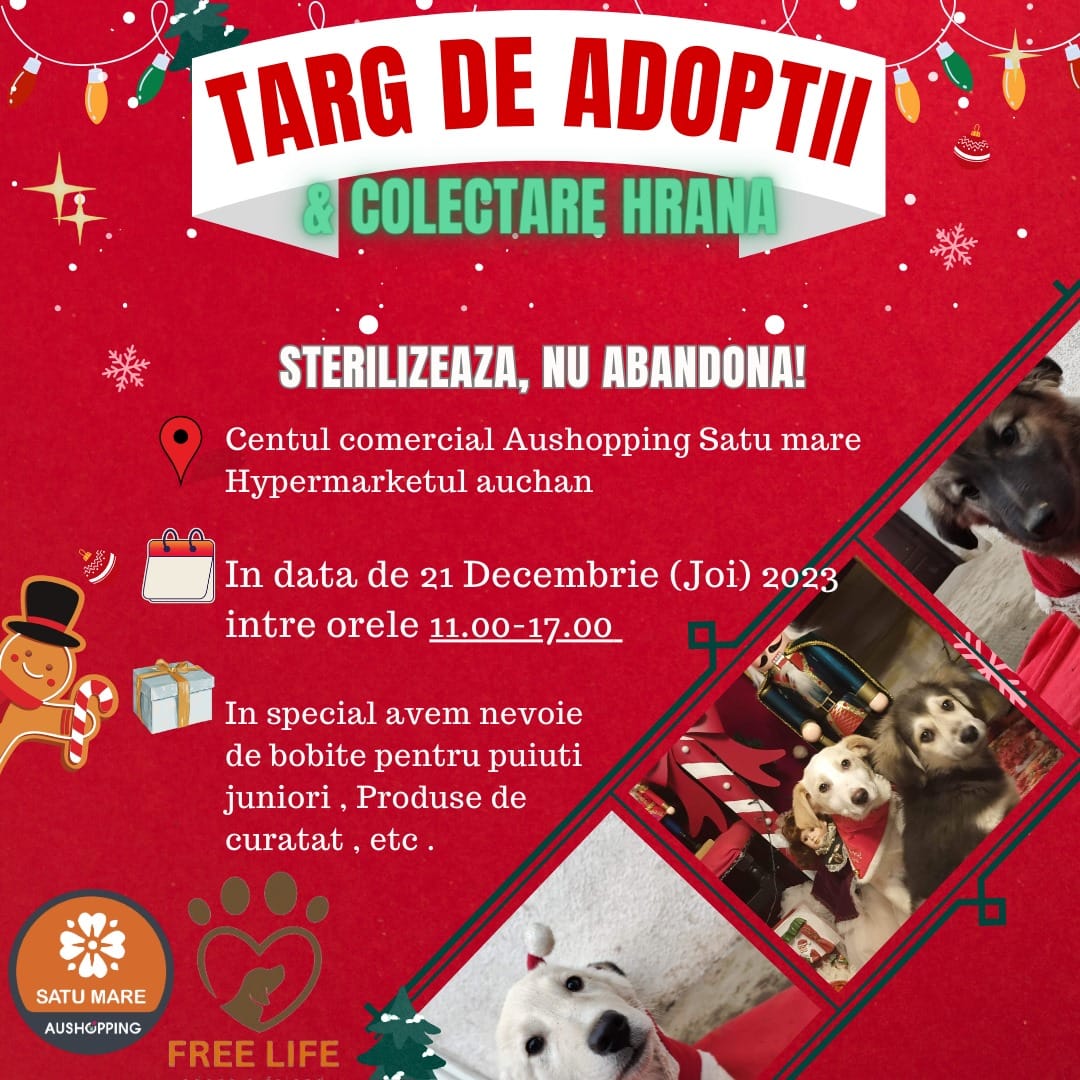 ”Vă așteptăm în număr cât mai mare la târgul de Crăciun organizat de asociația Asociatia Freelifesm . Orice donație este bine venită pentru a face sărbătorile mai frumoase pentru animăluțele noastre .” anunță organizatorii.