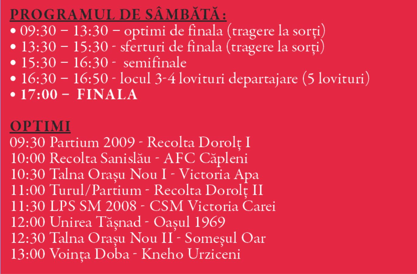 Vineri, 5 ianuarie, la sala LPS Ecaterina Both a continuat Cupa AJF “Ionel Borz” la fotbal în sală. S-au jucat ultimele două grupe, la finalul cărora a fost organizată o tragere la sorţi în vederea fazelor eliminatorii care vor avea loc sâmbătă, începând cu ora 09:30 (optimi).