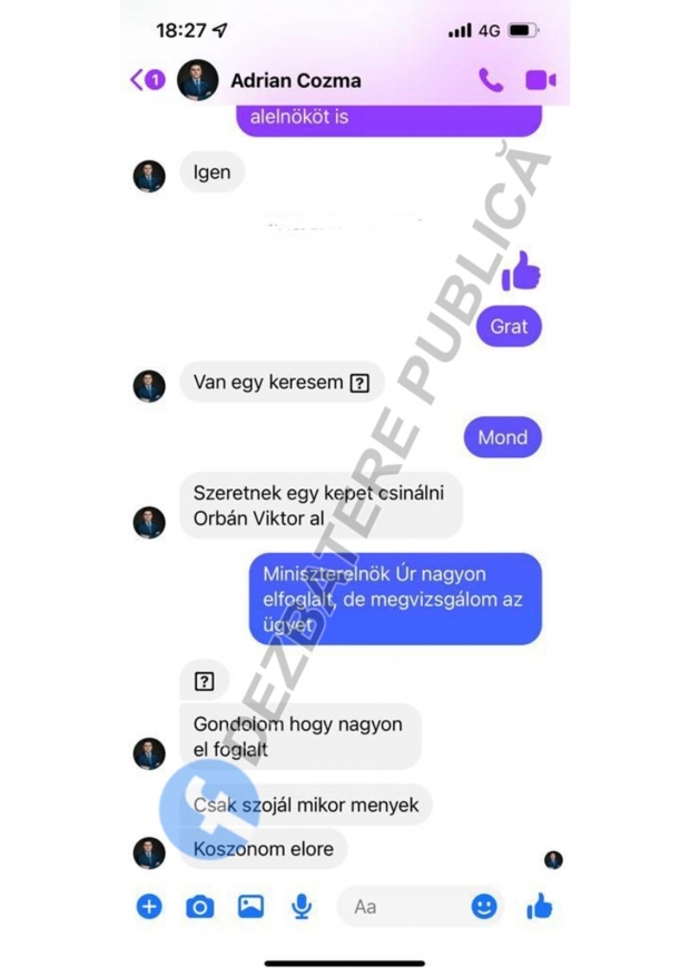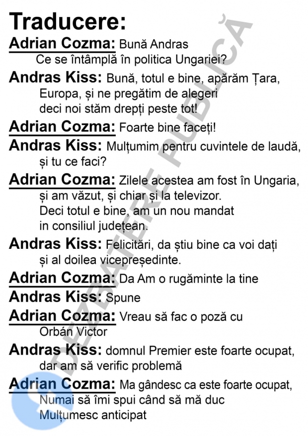 „Atașat aveți o conversație PRIVATĂ (originalul în maghiară precum și traducerea în română), a lui Adrian Cozma, cu Andras Kiss, membru al Alianței Civice Maghiare, FIDESZ. Andras Kiss este un foarte cunoscut și influent politician din Ungaria (Nyíregyháza). De asemenea, acesta este unul dintre cei mai apropiați oameni ai lui Viktor Orban (prim-ministru al Ungariei). Adrian Cozma îi cere lui Andras Kiss să-i REZOLVE o întâlnire cu Viktor Orban (prim-ministru al Ungariei), pentru a face "O POZĂ" cu acesta din urmă”, se arată în postare.