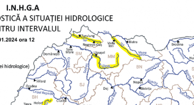 În intervalul 03.01.2024 ora 15:00 – 05.01.2024 ora 12:00 pe râurile din bazinele hidrografice: Crişul Negru – bazin amonte S.H. Beiuş şi afluenţii aferenţi sectorului aval S.H. Beiuş – amonte S.H. Tinca (judeţul Bihor), Crişul Alb – bazin amonte S.H. Gurahonţ şi afluenţii aferenţi sectorului aval S.H. Gurahonţ (judeţele: Hunedoara şi Arad), Timiş – bazin amonte S.H. Teregova şi afluenţii aferenţi sectorului aval S.H. Teregova – amonte S.H. Lugoj (judeţele: Caraş Severin şi Timiş).