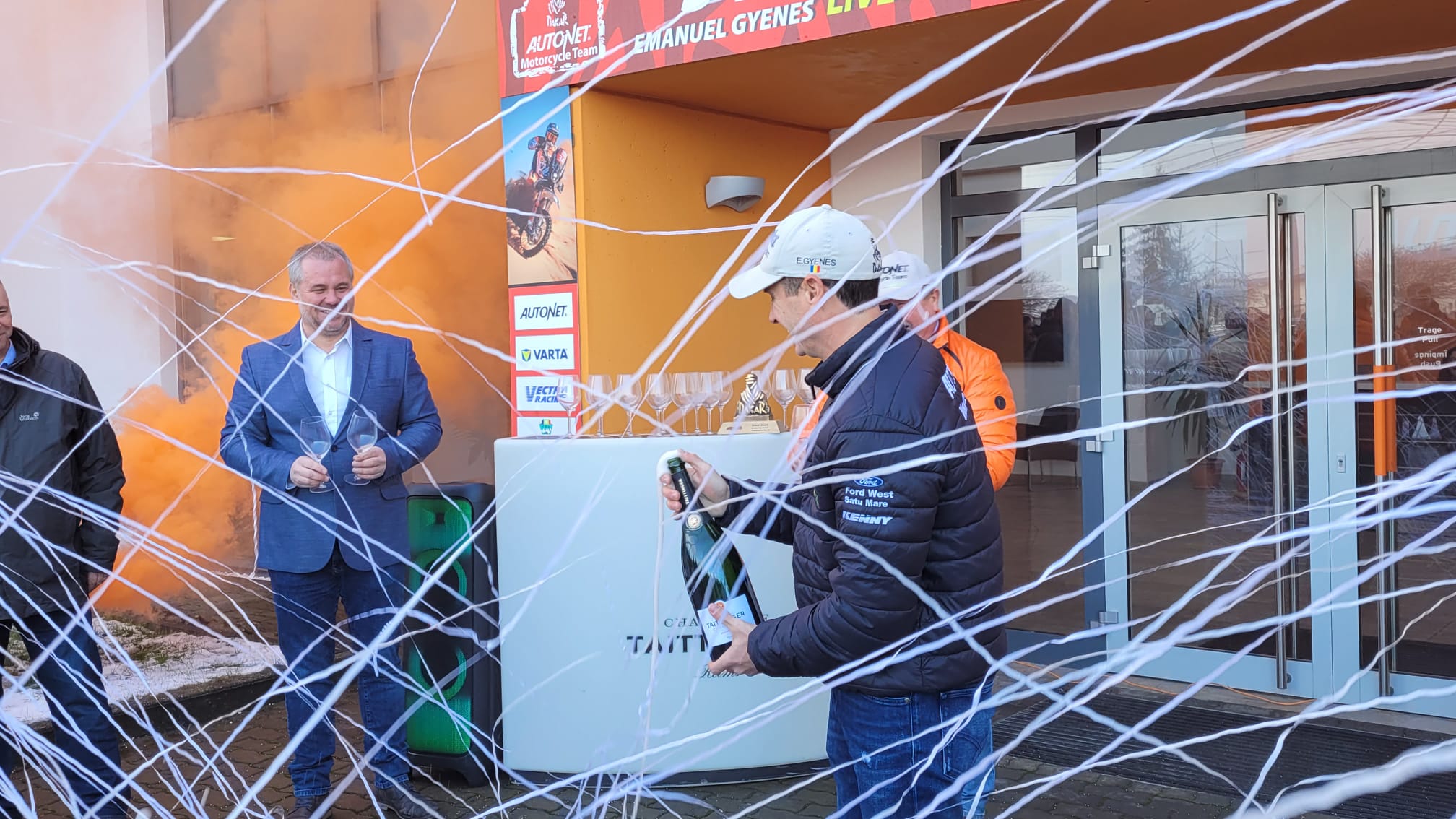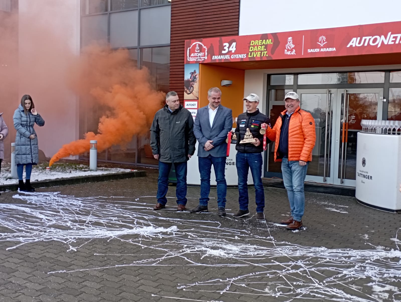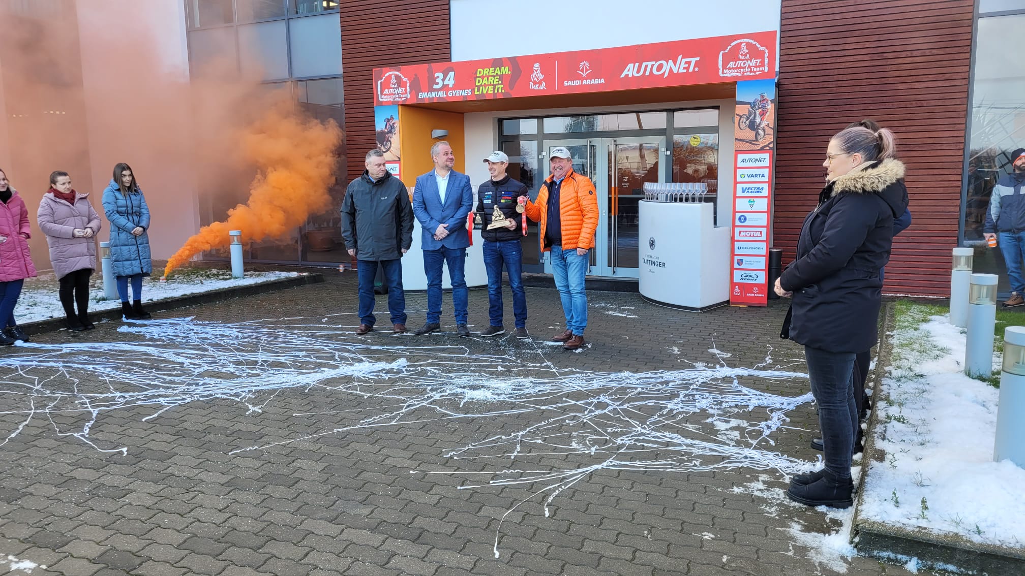 Riderul Autonet Motorcycle Team, Emanuel Gyenes, s-a întors duminică dintr-o nouă aventură în Raliul Dakar și, conform tradiției la revenirea acasă, la Satu Mare, colegii, prietenii de la Autonet Import precum și reprezentanții mass-media l-au primit cu aplauze, felicitări,confetti, fumigene dar și o cupă cu șampanie.