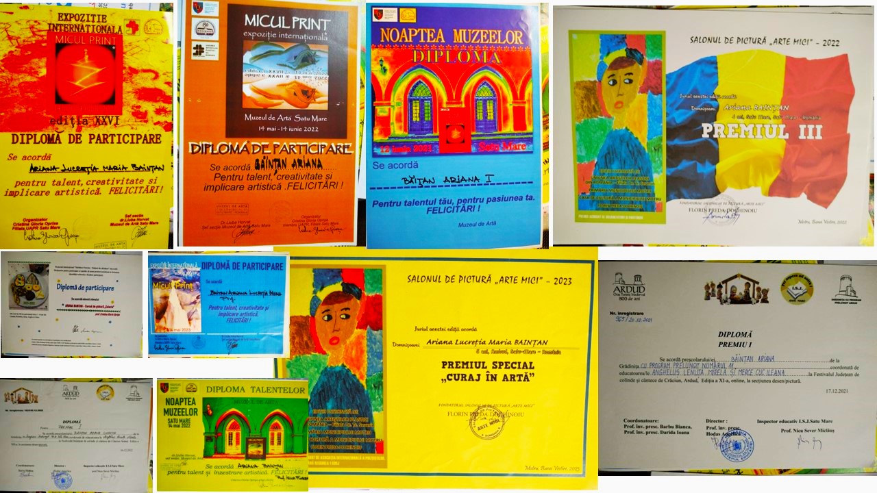 De această dată, sunt onorată să vă vorbesc despre Ariana, care demonstrează deja un talent remarcabil în domeniul picturii și pe care am cunoscut-o pe când avea doar 3 anișori.De la primele sale desene și experiențe cu pensula și culorile ne-am dat seama că ea posedă o altfel de înțelegere, mai profundă a formelor, culorilor și perspectivelor în artă care s-a rafinat datorită profesioniștilor sătmăreni din domeniu care au urmărit-o îndeaproape. Țin minte că Ariana avea nevoie doar de o coală albă, culori și inspirația era mereu cu ea...de la lumea necuvântătoarelor pe care le adoră, la colegii ei de grupă sau la sărbătorile importante, mai ales Crăciunul, reușește să surprindă pe hârtie emoția și bucuria pură a copilăriei.