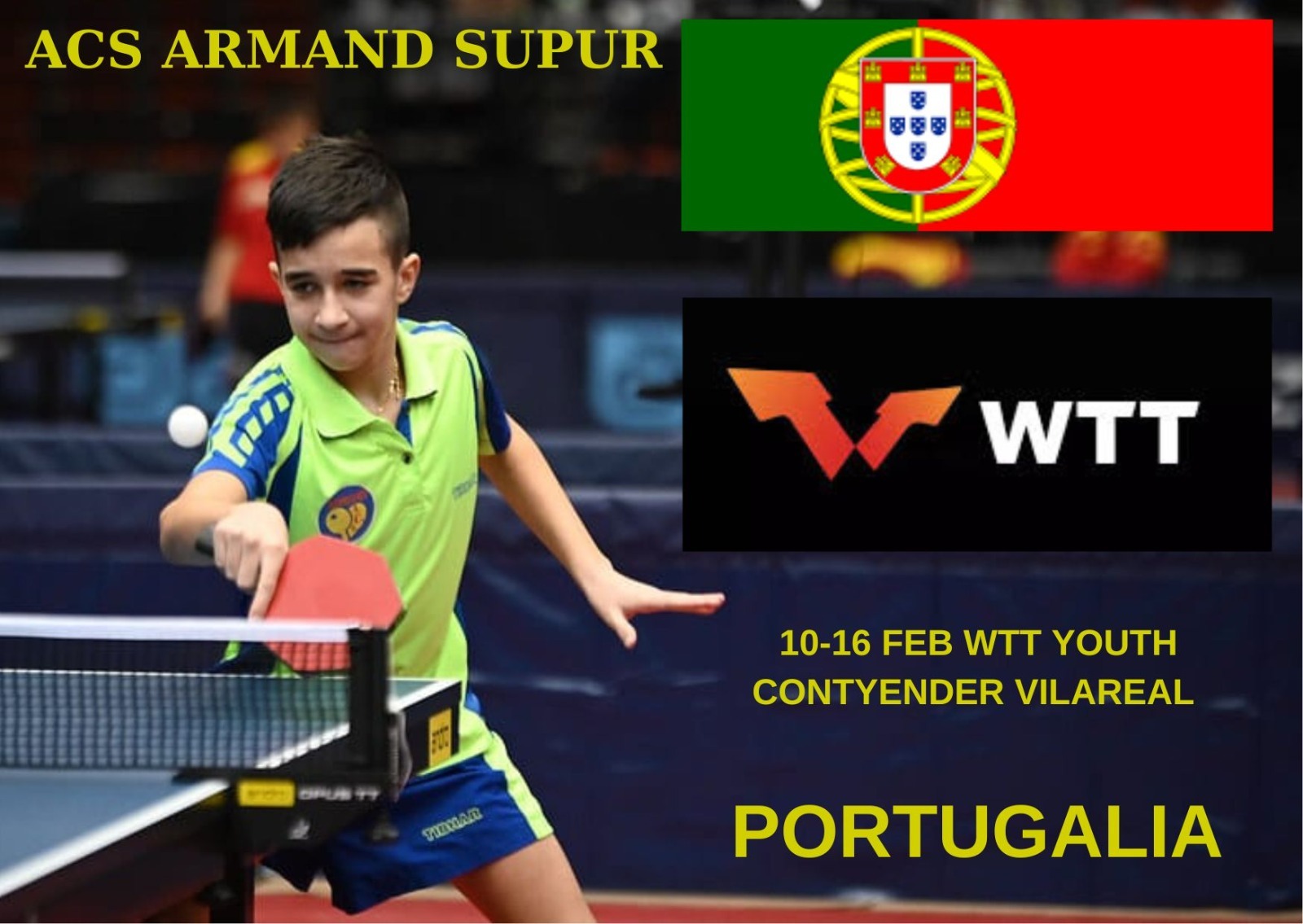 ”La doar 11 ani, Albert e singurul reprezentant al României la WTT din Vilareal-Portugalia. Mergem la categoria U13 după puncte în clasamentul mondial . Suntem încrezători și ducem faima județului și a României la competițiile importante”, transmit oficialii clubului pe pagina de facebook CS Armand Supur.