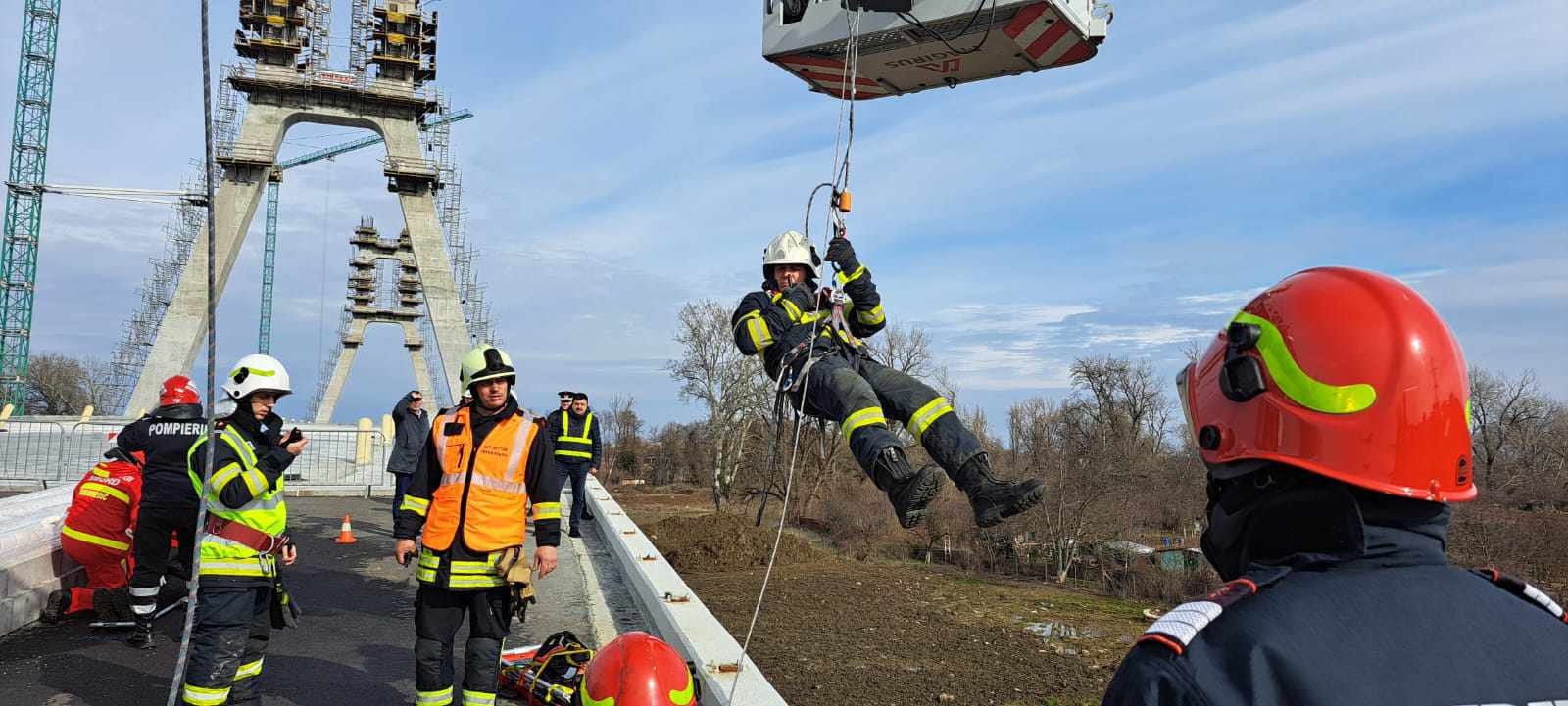 Pompierii au început simultan acţiunile de salvare a celor trei persoane, executând operaţiunile în ordinea în care să asigure cât mai multe şanse victimelor. În acelaşi timp, un alt echipaj s-a ocupat cu descarcerarea ocupantului maşinii căzută la baza podului, în urma impactului. După ce a fost descarcerată victima din autoturism, aceasta a fost ridicată la nivelul ambulanțelor situate pe pod, cu ajutorul autoscării.