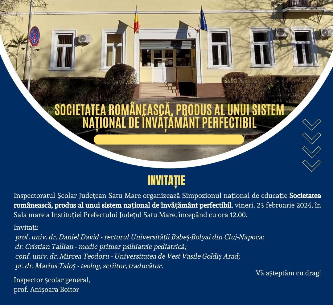 În data de 23 februarie 2024, începând cu ora 12.00, în Sala Mare de Ședințe a Prefecturii județului Satu Mare, se va desfășura Simpozionul național „SOCIETATEA ROMÂNEASCĂ, PRODUS AL UNUI SISTEM NAȚIONAL DE ÎNVĂȚĂMÂNT PERFECTIBIL”.