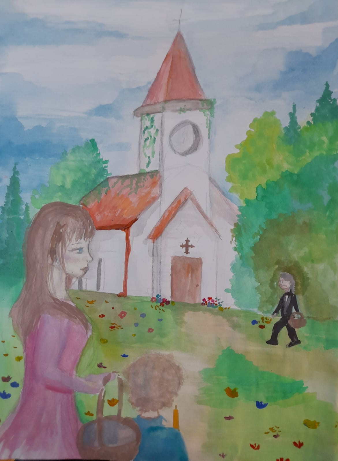 („Tradiții românești” - Neș Nadia, clasa a VIII-a, Colegiul Național „Ioan Slavici” - Satu Mare, Tehnica: Tempera, profesor, Florea Irina)