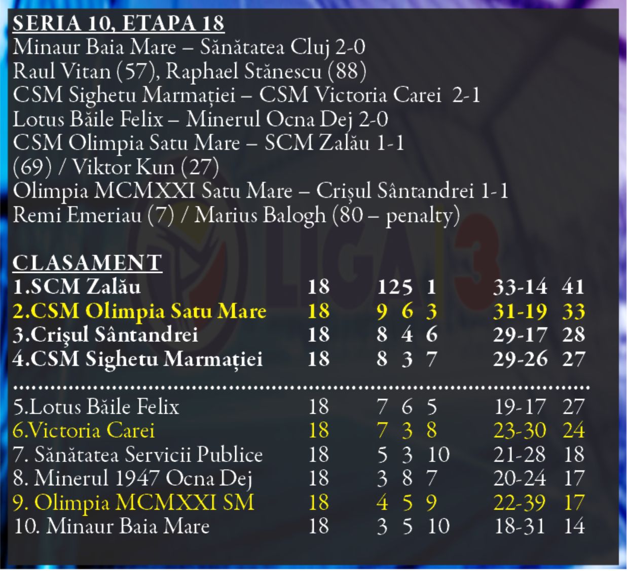 Dacă pentru careieni doar o victorie la Sighet, coroborată cu un rezultat pozitiv al celor de la Minerul Ocna Dej la Felix, aducea calificarea în TOP 4, în schimb, maramureșenii își asigurau calificarea cu un succes în condițiile în care Lotus s-a chinuit cu modesta Minerul.