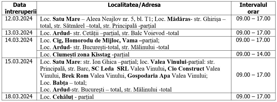 DISTRIBUȚIE ENERGIE ELECTRICĂ ROMANIA S.A. - Sucursala Satu Mare anunţă întreruperea alimentării cu energie electrică: