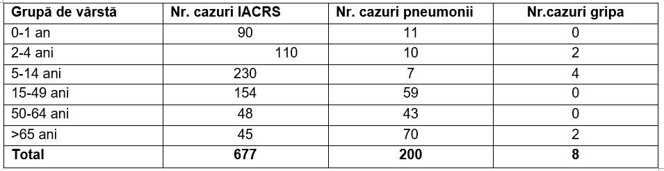 Ratele de incidență cele mai crescute pentru IACRS s-au înregistrat la grupa de vârstă 5-14 ani (0,60‰), pentru pneumonii la grupa de vârstă peste 65 de ani (0,18 ‰), iar pentru gripă la grupa de vârstă 5-14 ani (0,01 ‰).