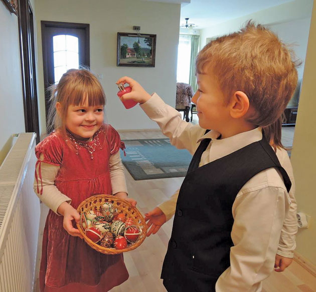 A doua zi de Paşti, băieţii stropesc fetele cu parfum sau cu apă parfumată şi îşi urează noroc unii altora, iar fetele îi recompensează cu ouă vopsite.