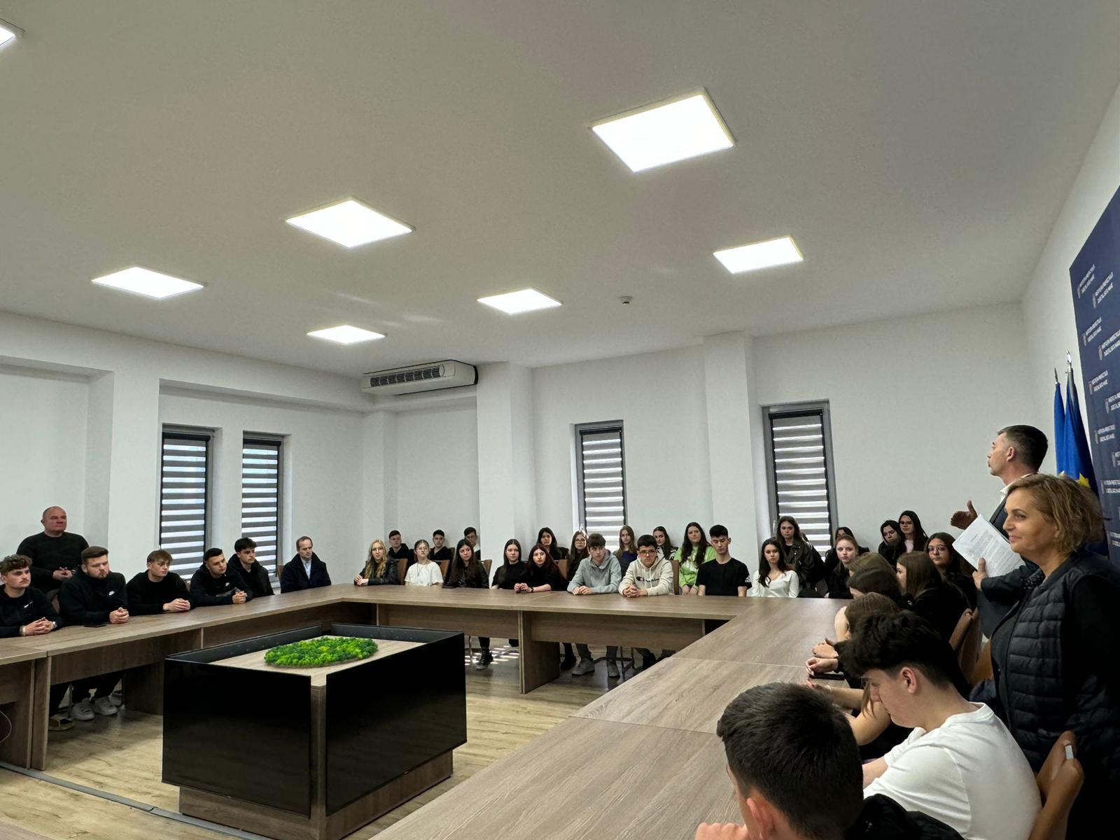 Prefectul Radu Roca alături de subprefectul Romeo Pop , de directorul de Cancelarie , Radu Iancu , de secretarul general , Cosmin Dorle și de Ramona Antonescu, șef serviuciu au prezentat elevilor activitățile curente ale instituției și au purtat un dialog deschis cu aceștia pe subiecte de interes.