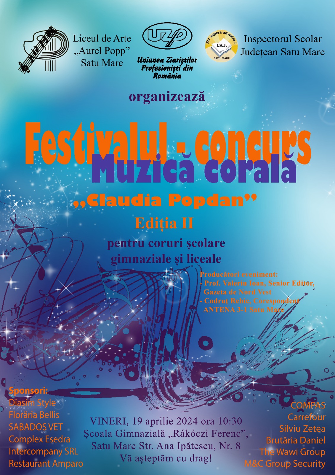 Felicităm toți profesorii și elevii care au participat la această a II-a Ediție a Festivalului Coral ”CLAUDIA POPDAN”, dar și laureații acestei gale. Doamnelor și domnilor profesori de muzică și desen vă asigurăm că GAZETA DE NORD VEST și UNIUNEA ZIARIȘTILOR PROFESIONIȘTI DIN ROMÂNIA va susține fiecare act de cultură pe care dumneavoastră doamnelor și domnilor profesori, le veți creea împreună cu elevii.