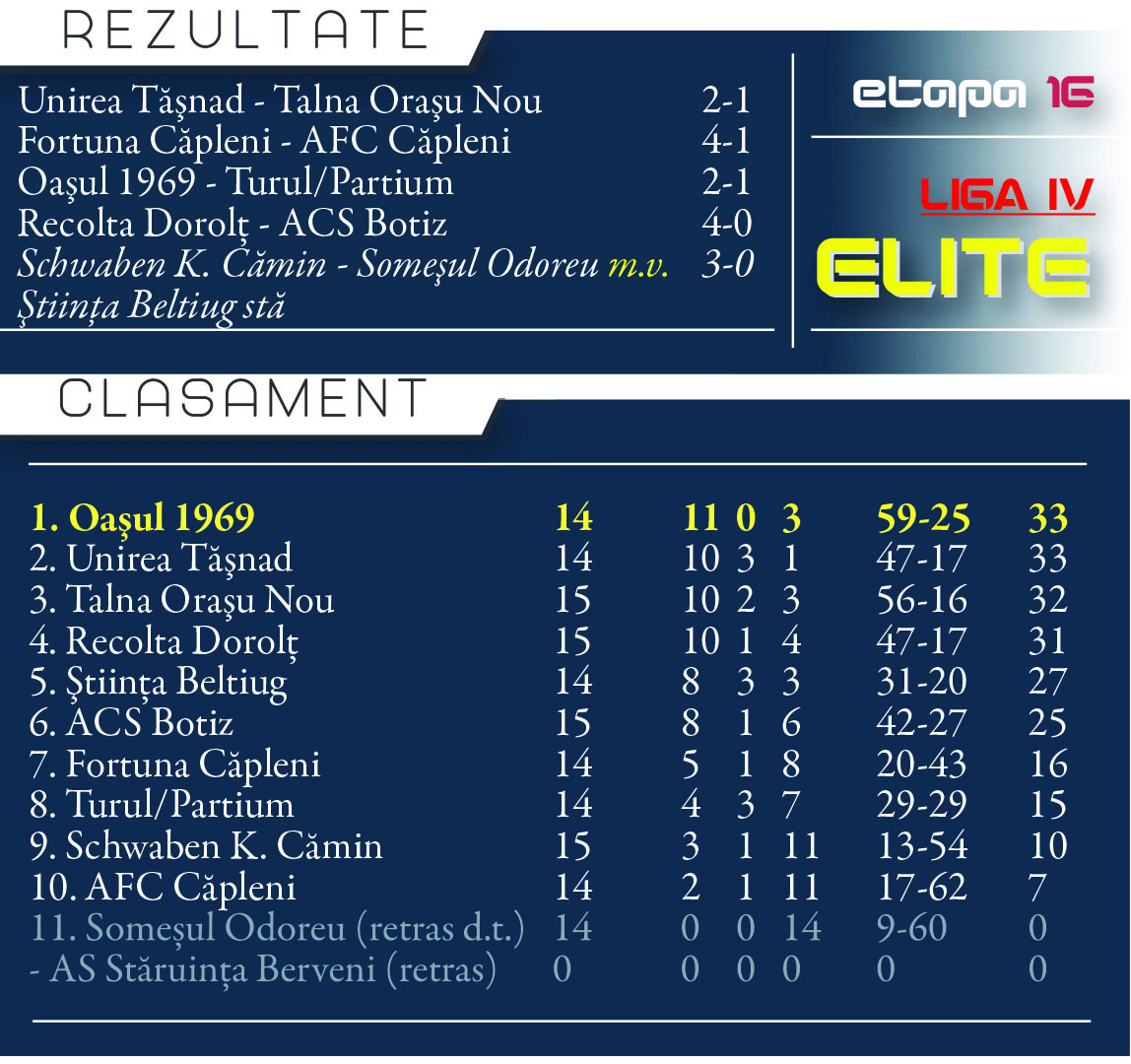 Oașul Negrești Oaș a revenit, la golaveraj, pe prima poziție a clasamentului din ELITE după disputarea etapei a 16-a.