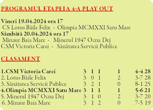 Olimpia MCMXXI Satu Mare joacă vineri în etapa a 4-a din playout-ul Ligii a 3-a la fotbal, Seria a 10-a.