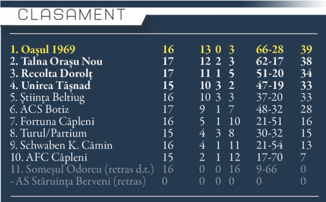 Oașul a câștigat sâmbătă duelul cu Recolta Dorolț, scor 3-2, și și-a consolidat poziția de lider, apoi a doua zi, Talna s-a impus lejer, 3-1, în fața combinatei Turul-Partium, scor 3-1, și echipa lui Nelu Donca e pe doi la un punct în spatele vecinilor de la Negrești Oaș.