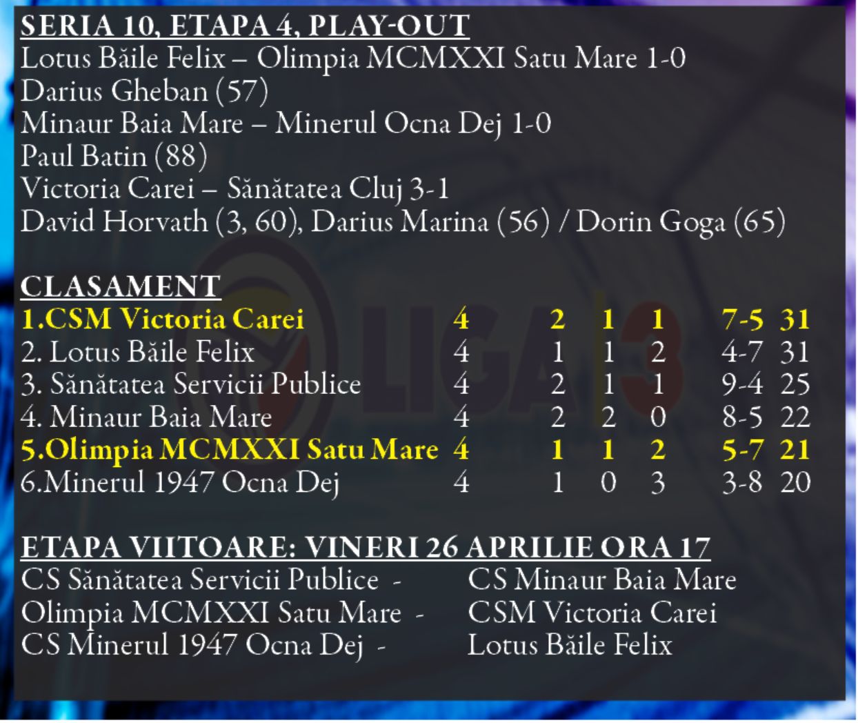 Partida s-a încheiat cu scorul de 3-1 și se poate spune că e cea mai categorică victorie a Victoriei Carei în Playout... Urmează derby-ul județean din playout, de la Satu Mare, cu Olimpia 1921 .
