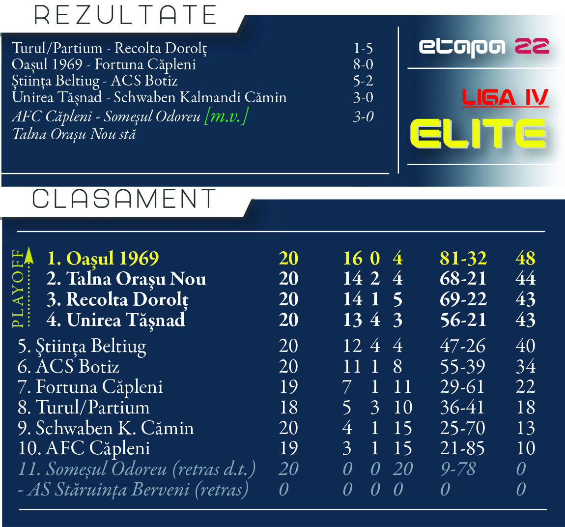 După terminarea sezonului regulat, Oașul Negrești, Talna Orașu Nou, Recolta Dorolț și Unirea Tășnad au terminat pe primale patru poziții și vor juca pentru calificarea în marea finală. Și apoi pentru accederea la barajul de promovare în Liga a 3-a.