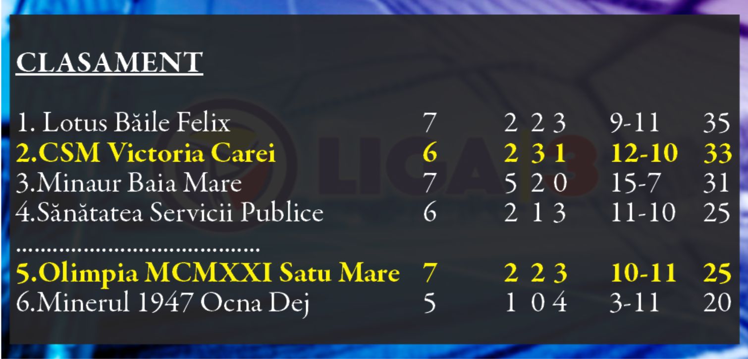 Olimpia MCMXXI Satu Mare stă în această etapă în care ar fi trebui să joace cu retrasa Minerul Ocna Dej. Sătmărenii luptă în continuare cu Sănătatea Cluj să scape de penultimul loc, unul retrogradabil