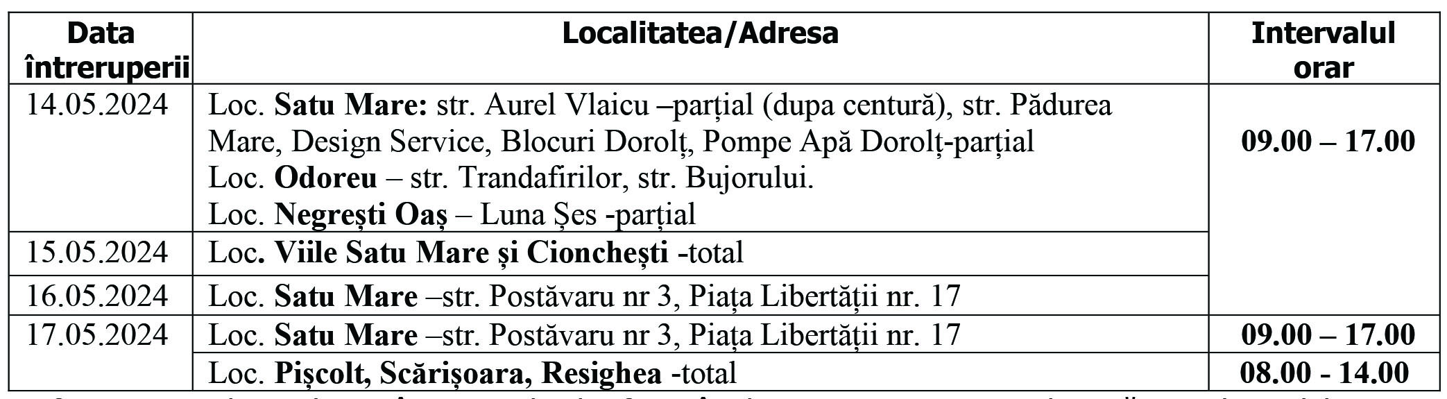 DISTRIBUȚIE ENERGIE ELECTRICĂ ROMANIA S.A. - Sucursala Satu Mare anunţă întreruperea alimentării cu energie electrică: