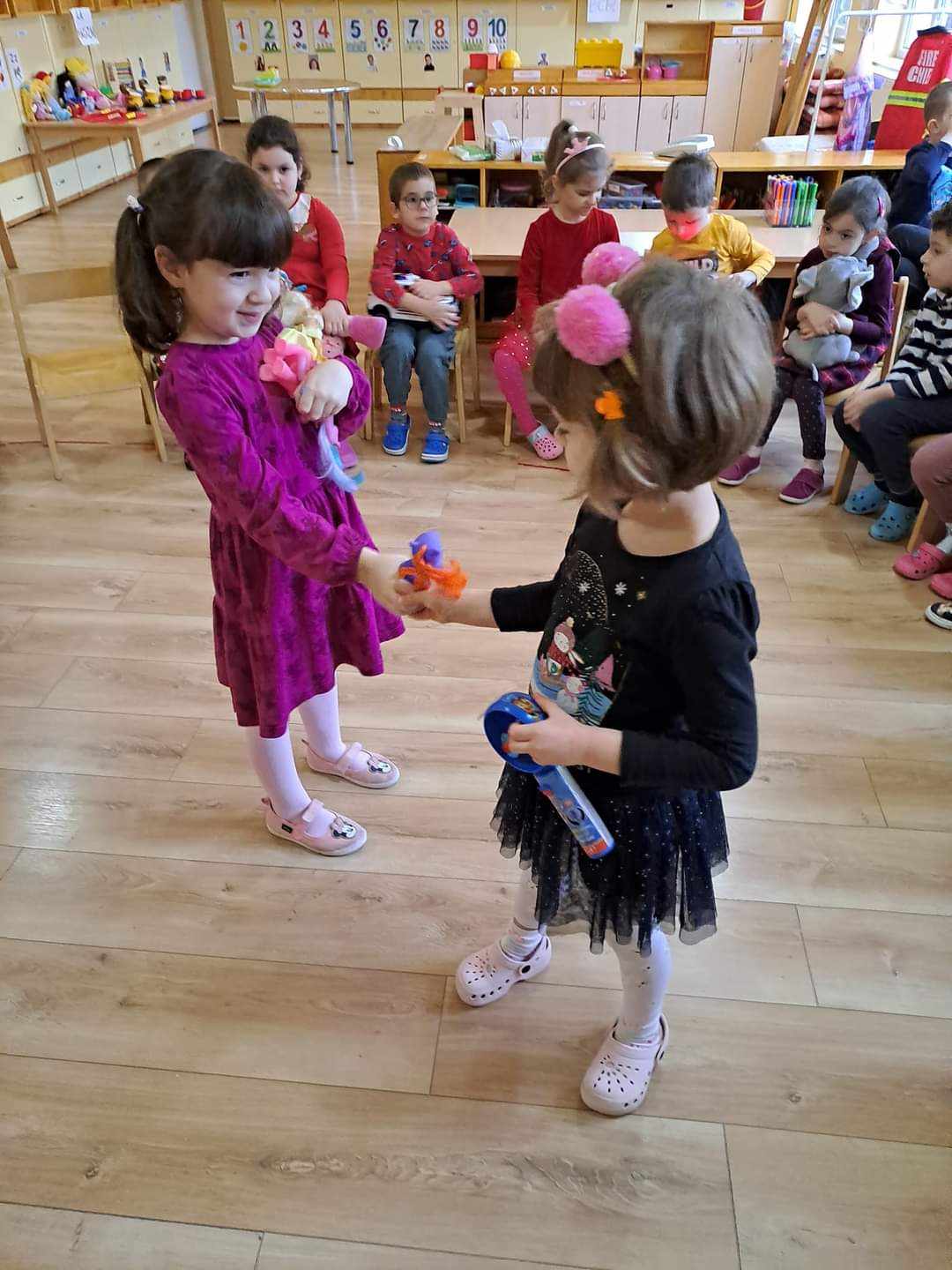 "Grupa mare" "D " de la Grădinița cu Program Prelungit Nr. 11 Satu Mare a stabilit ziua de joi-ziua trocului. În fiecare joi toți copiii vin cu o jucărie la grădinița. Copiii se așează în cerc și analizează jucăriile colegilor apoi trec la negocieri cu colegii care au o jucărie ca și a lor, ca valoare. Dupa ce s-a stabilit cine cu cine face troc se trece la schimb, se bate palma și nu se mai revine asupra schimbului.