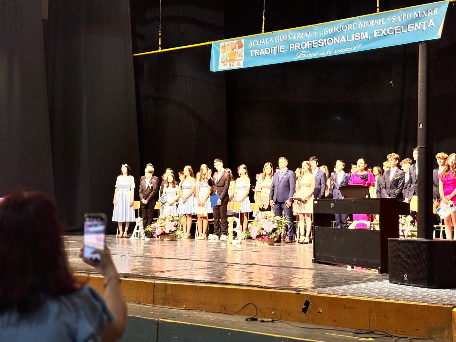 În paralel, Școala Gimnazială Grigore Moisil și-a organizat festivitatea la Casa de Cultură a Sindicatelor din Satu Mare. Directorul Claudiu Mondici a urcat pe scenă pentru a-și prezenta mesajul de încurajare pentru absolvenții de gimnaziu, a celor trei clase, A, B și C.
