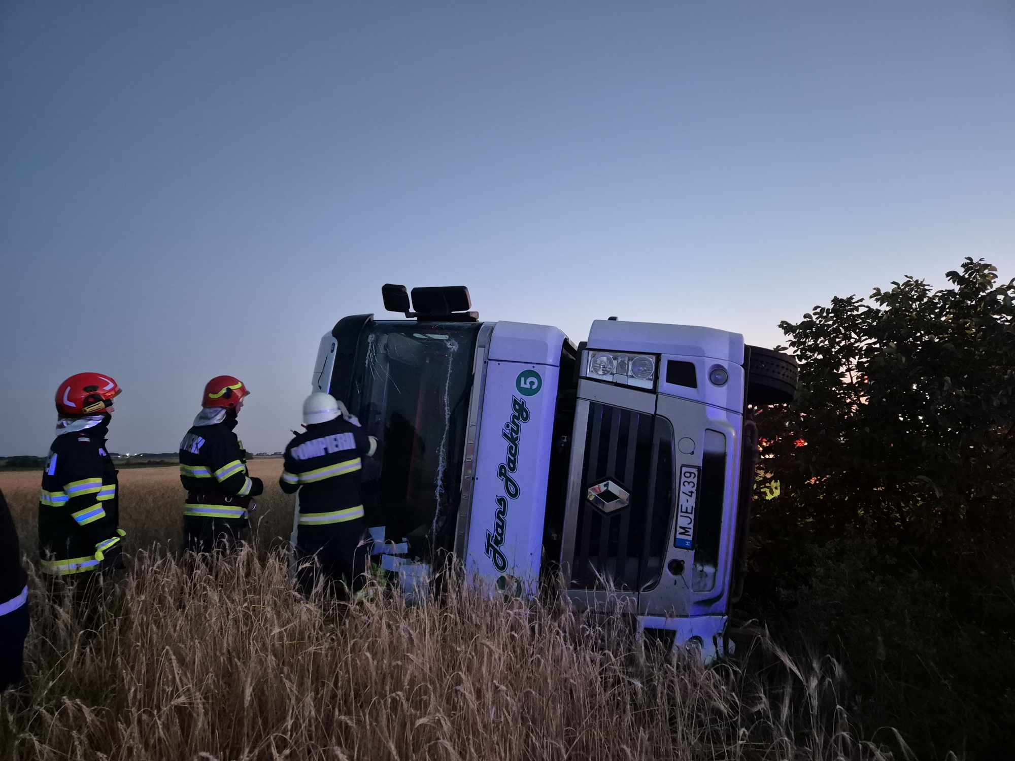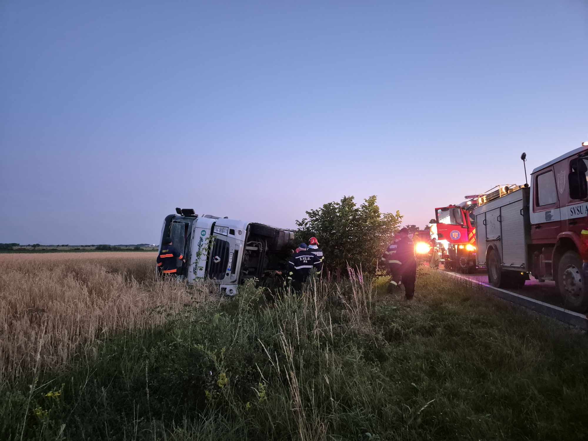 Inspectoratul pentru Situații de Urgență SOMEȘ al județului Satu Mare a fost alertat să intervină marți dimineață, în jurul orei 04.30, în cazul producerii unui accident rutier în care a fost implicat un ansamblu TIR, care a părăsit partea carosabilă și s-a răsturnat.