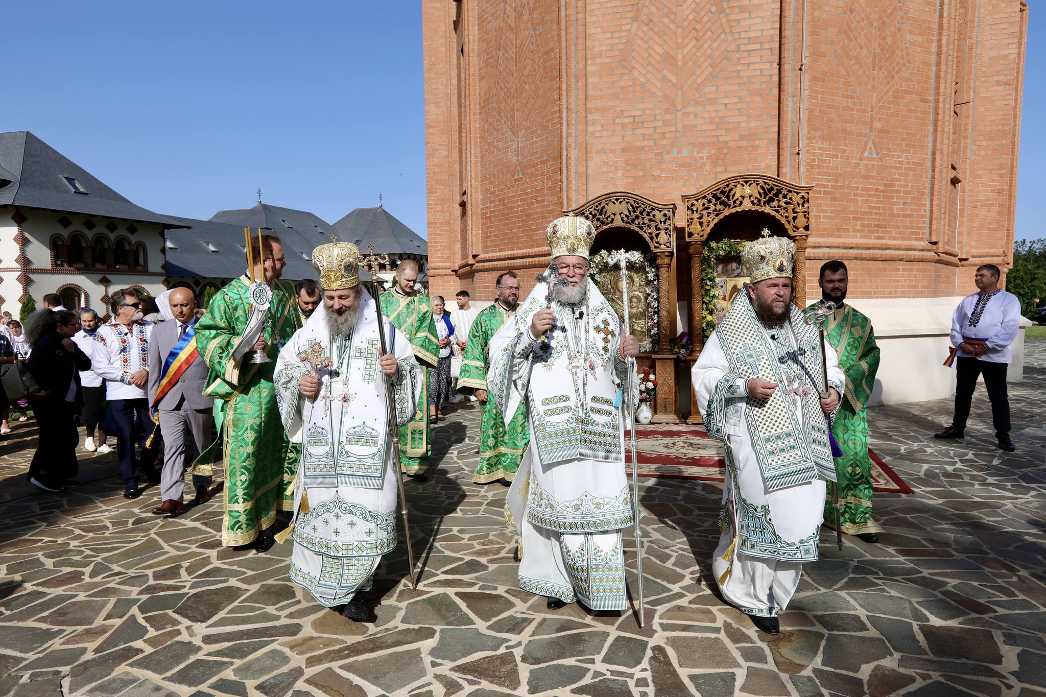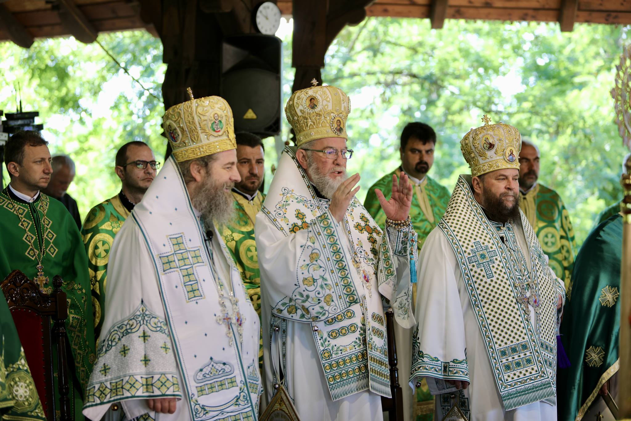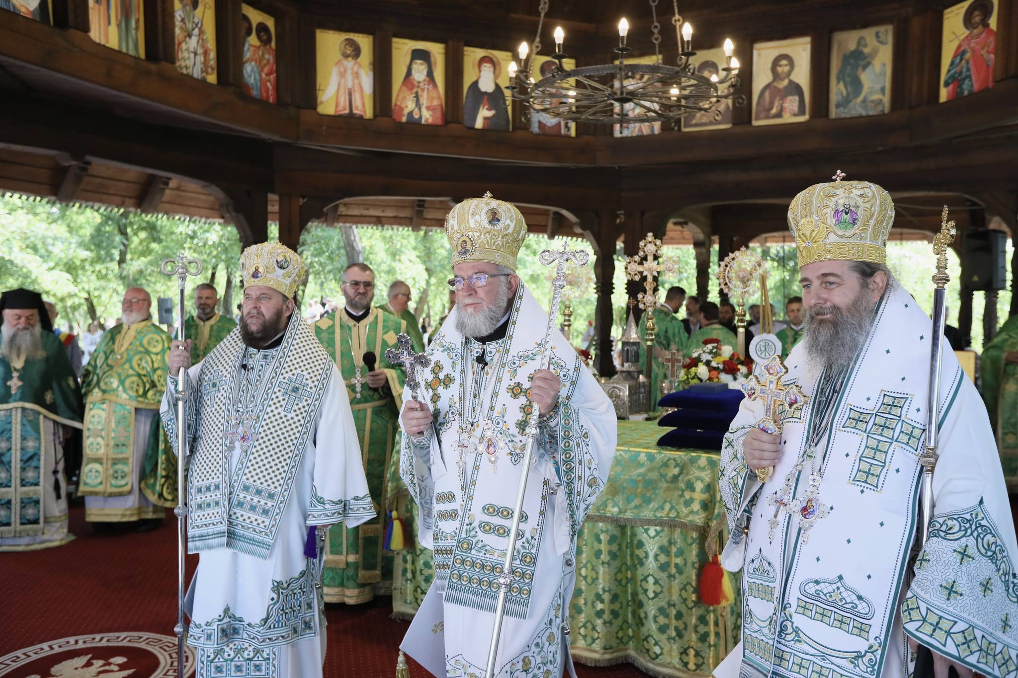 Slujbă întreit arhierească la Mănăstirea Scărișoara Nouă din județul Satu Mare. Trei episcopi au slujit în altarul de vară al acestei mănăstiri.