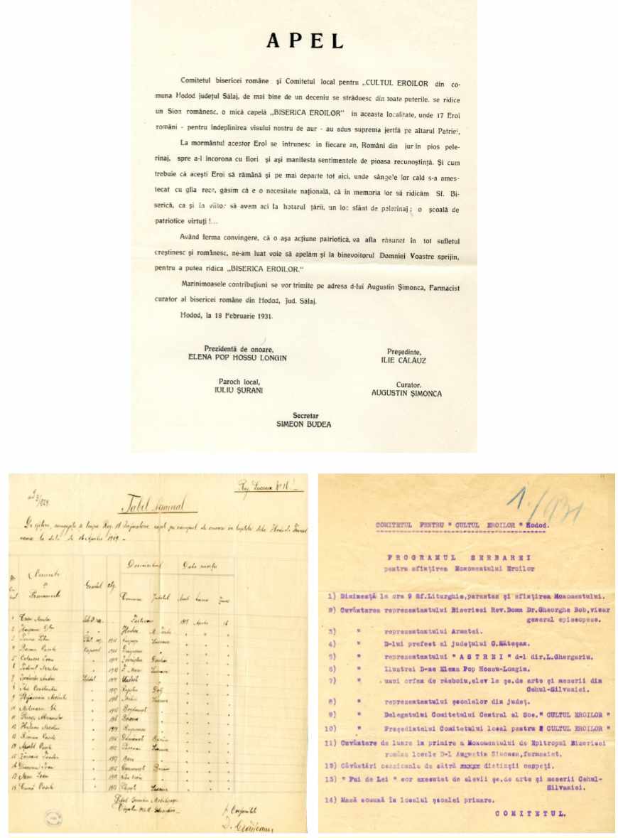 Eroii căzuţi aici erau îngropaţi în cimitirul reformat din localitate. „Mormintele eroilor erau acoperite cu cununi de flori. După terminarea parastasului, de la mormintele Eroilor Români, întreaga asistenţă a plecat în procesiune, la cei trei Eroi Maghiari, îngropaţi în cimitirul reformat, unde preotul reformat a ţinut o cuvântare mai frumoasă ca oricând…” Din acest document aflăm că în aceeaşi zi, după masa, s-a întrunit „Comitetul aranjator al serbărilor obicinuite”, pentru a hotărî dacă că Eroii căzuţi la Hodod vor fie exhumaţi şi duşi la Zalău, unde se concentrează toţi eroii - aproape 100 de inşi - din întreg judeţul Sălaj, sau vor rămâne la Hodod, unde se vor aduce şi osemintele a doi eroi români căzuţi în localităţile Corni şi Bârsăul de Jos. Este vorba de sergentul Ontariu Marin şi caporalul Câmpean Vasile. Şedinţa s-a datorat faptului că un reprezentant al Societăţii Cultul Eroilor din Bucureşti, locotenent Agache Alexandru, s-a deplasat la Hodod cu delegaţia de a muta eroii căzuţi aici a Zalău. Decizia unanimă a fost ca osemintele eroilor să rămână la Hodod, însă exhumate şi mutate în locul unde se va construi monumentul mult dorit. De altfel, la acea dată, Comitetul avea deja un fond de circa 80.000 lei „colectaţi de repausatul dr. Pop Mihai, fost avocat şi senator din Cehul Silvaniei, cu scopul de a se ridica un monument Eroilor căzuţi”.