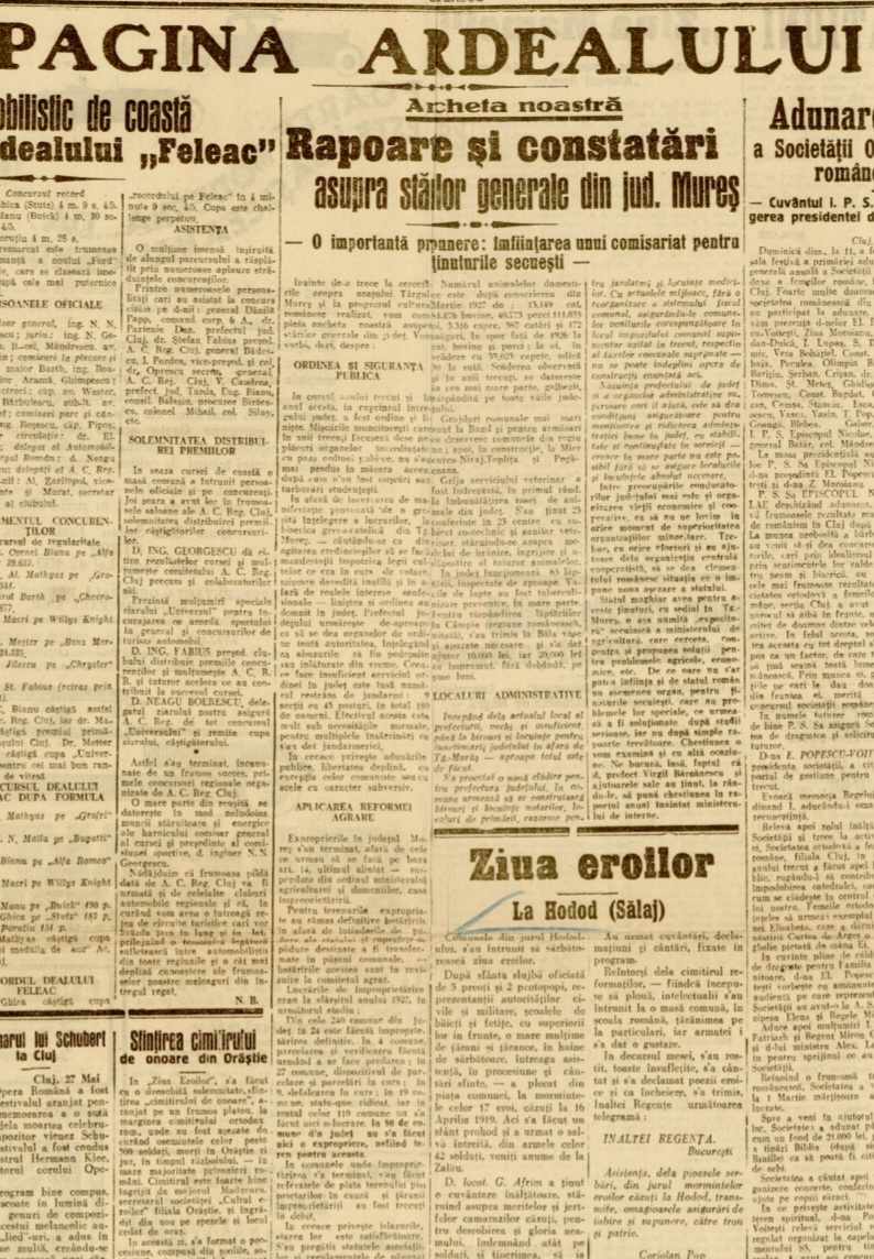 Sfinţirea Monumentului de la Hodod ridicat în memoria şi cinstirea acestor eroi a avut loc la 29 mai 1931, de Ziua Eroilor. Până la ridicarea acestui monument, în toţi anii, de Ziua Eroilor, se făcea pelerinaj la Hodod, participând oficialităţile judeţului, armata, elevii, localnicii şi preoţii din jurul Hododului. Cu ocazia sfinţirii au venit la Hodod şi rude ale celor căzuţi din Basarabia, Moldova şi Muntenia. Evenimentul a fost unul de mare anvergură, fiind deschis de o liturghie, parastasul pentru eroii căzuţi la datorie şi sfinţirea monumentului de către vicarul Bisericii Greco-Catolice, dr. Gheorghe Bob. Au susţinut alocuţiuni reprezentantul Armatei, prefectul judeţului Sălaj G. Mateşan, reprezentanţi ai ASTREI şi ai Societăţii „Cultul Eroilor”, precum şi alte oficialităţi şi reprezentanţi ai presei locale şi naţionale. La finalul evenimentelor, organizatorii au trimis telegrame de mulţumire Regelui Carol al II-lea şi primului ministru Nicolae Iorga.