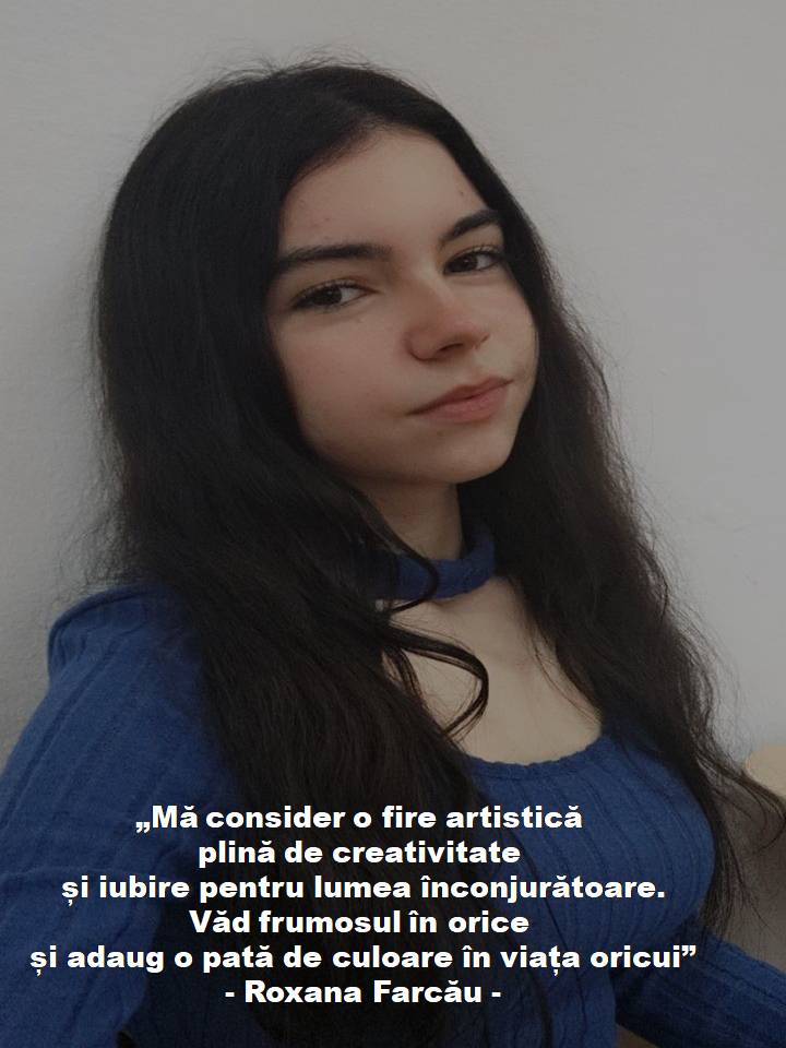 Pasiunea ei, pentru desen a început încă din copilărie, iar legătura noastră este una extrem de strânsă și apropiată. Prin intermediul artei, avem un canal de comunicare profundă și autentică, ce ne permite să ne exprimăm gândurile și sentimentele într-un mod unic și special. Roxana este dotată cu o inteligență remarcabilă și un talent deosebit în arta ei, prin care își exprimă emoțiile și gândurile cu o frumusețe aparte. Fiecare detaliu în creațiile sale este atent lucrat, iar culorile pastelate pe care le folosește reflectă subtilitatea și grația personalității sale. Sunt mândră de fiecare reușită a ta Roxana și sunt convinsă că ai un viitor strălucit în față. Doresc să-ți transmit că în viață totul este posibil, dacă-ți vei urma pasiunea și-ți vei păstrează credința în sine. Roxana este o sursă de inspirație pentru mine și pentru toți cei din jurul ei, iar dedicarea și talentul ei în artă sunt o reflectare a frumuseții și profunzimii sufletului său.”