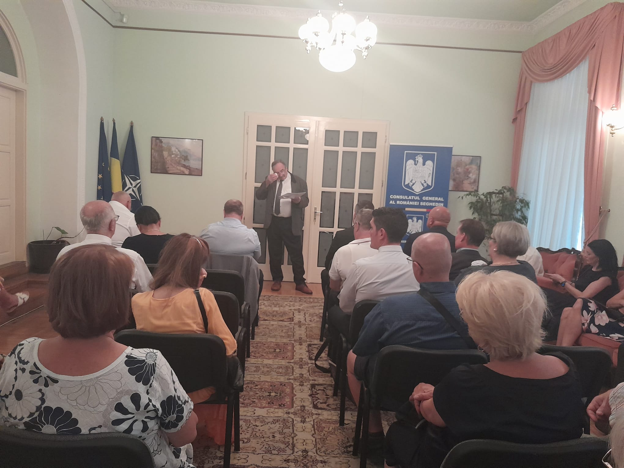 În continuarea programului manifestării, la sediul Consulatului General al României la Seghedin a avut loc o expunere, în care istoricul ungar László Marjanucz a vorbit despre contextul istoric al Revoluţiei din 1848 din Transilvania; prof. Gheorghe Petruşan a susţinut o prelegere intitulată “Românii din Ungaria – trecut şi prezent”, cu referiri la Revoluţia de la 1848, importanţa acţiunilor revoluţionarilor români Nicolae Bălcescu, Avram Iancu, dar şi rolul marelui ierarh Andrei Şaguna. Gheorghe Cozma, preşedintele AŢRU, în cadrul expunerii “Românimea din Ungaria – prezent şi viitor”, a făcut referiri la acţiunile concrete ale instituţiei pe care o conduce, în ceea ce priveşte dezvoltarea învăţământului în limba română în cadrul instituţiilor şcolare ale comunităţii; îmbunătăţirea vieţii culturale a comunităţii, dar nu în ultimul rând, intensificarea legăturilor cu Ţara Mamă, România.
