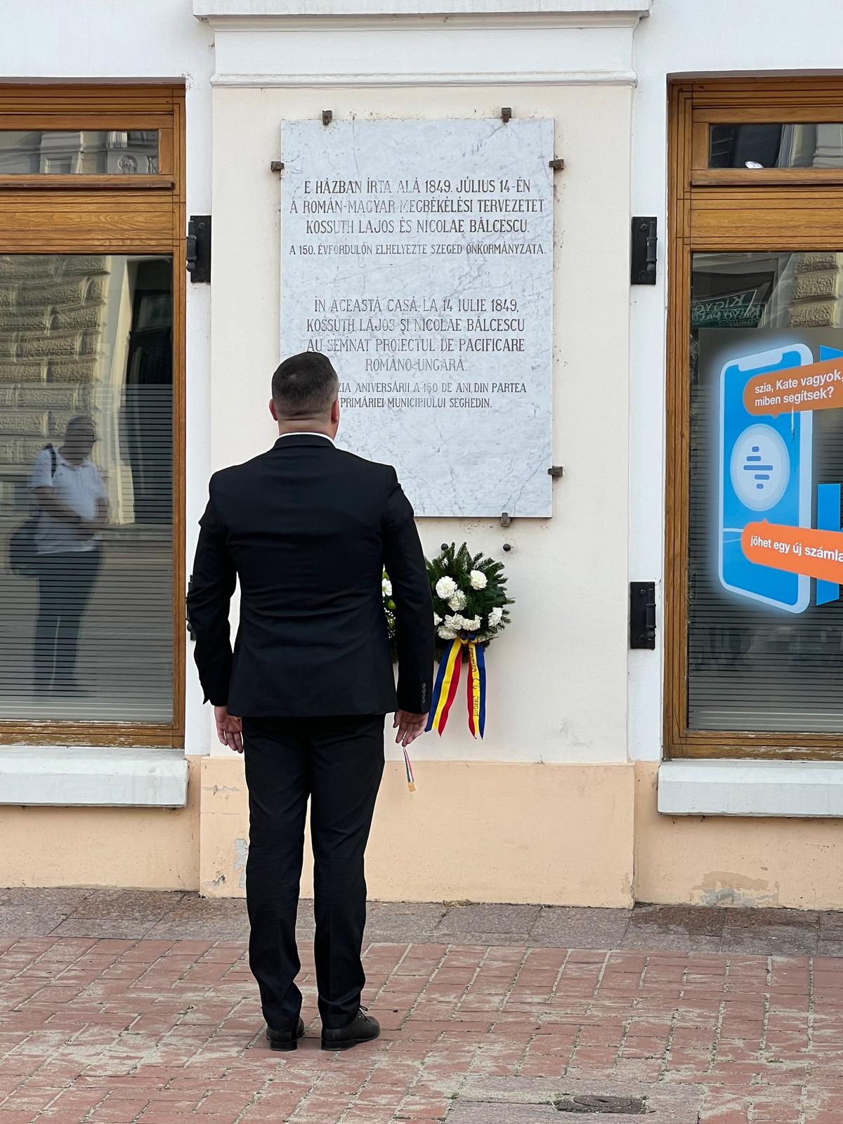 La placa comemorativă situată în Piaţa Klauzal din centrul municipiului Seghedin, al treilea oraş ca mărime a Ungariei, placă amplasată pe zidul clădirii în care s-au întălnit Bălcescu şi Kosuth, a avut loc o ceremonie urmată de depunere de coroane de flori.