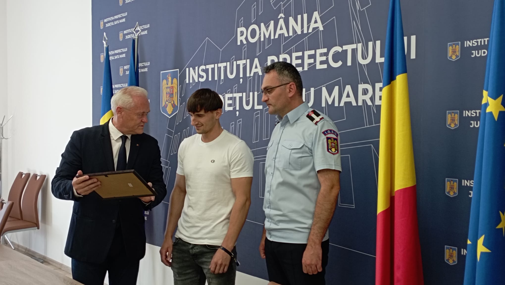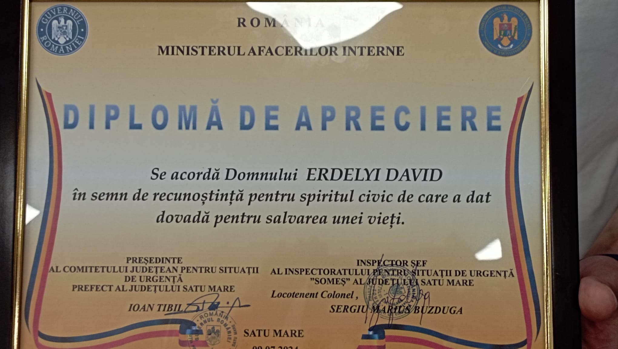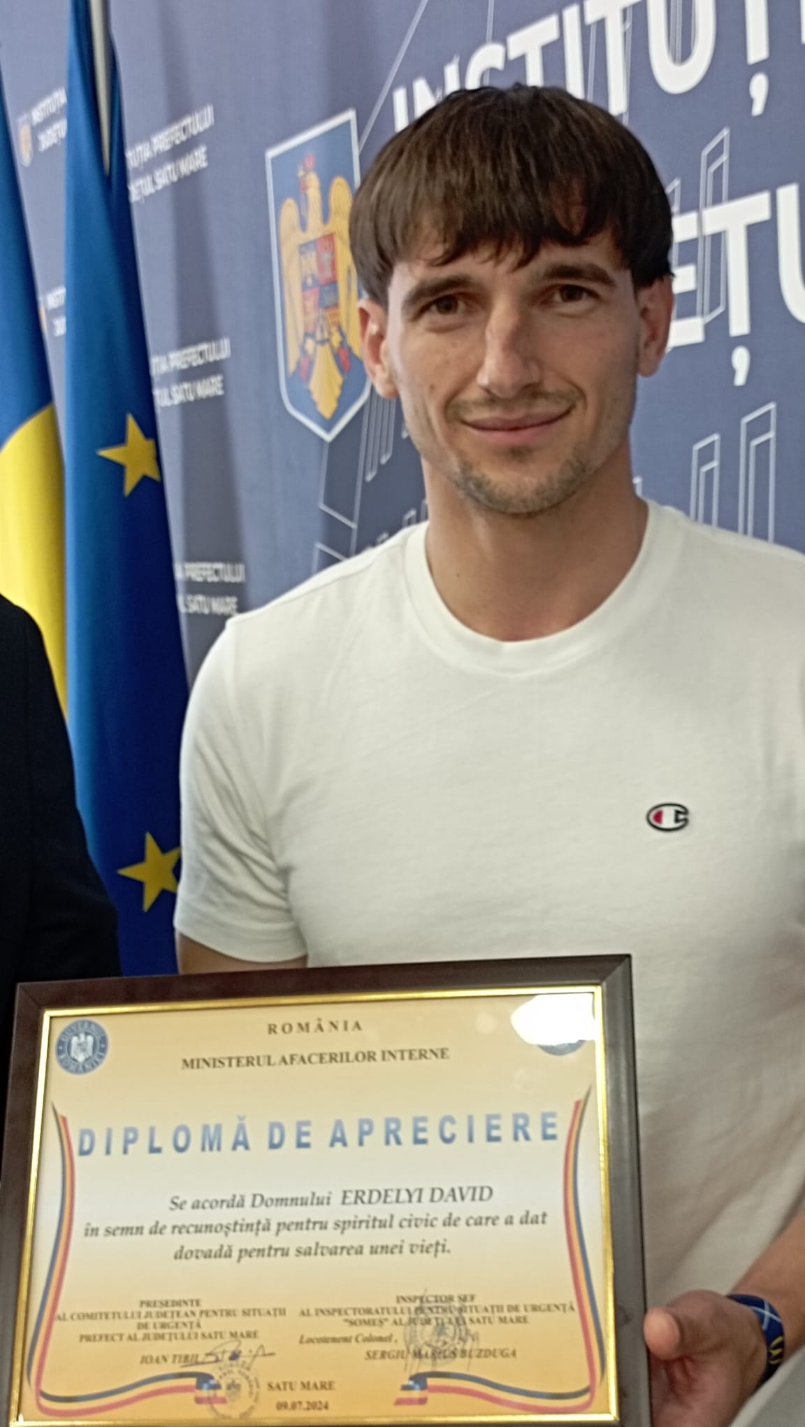 Prefectul județului Satu Mare, Ioan Tibil, în calitatea de Președinte al Comitetului Județean pentru Situații de Urgență alături de inspectorul șef al Inspectoratului pentru Situații de Urgență SOMEȘ al județului Satu Mare, locotenent colonel Buzduga Sergiu Marius, i-au mulțumit și i-au acordat azi o ”Diplomă de apreciere” tânărului Erdelyi David, care luni după amiază a salvat de la înec o tânără de 20 de ani din apele râului Someș.