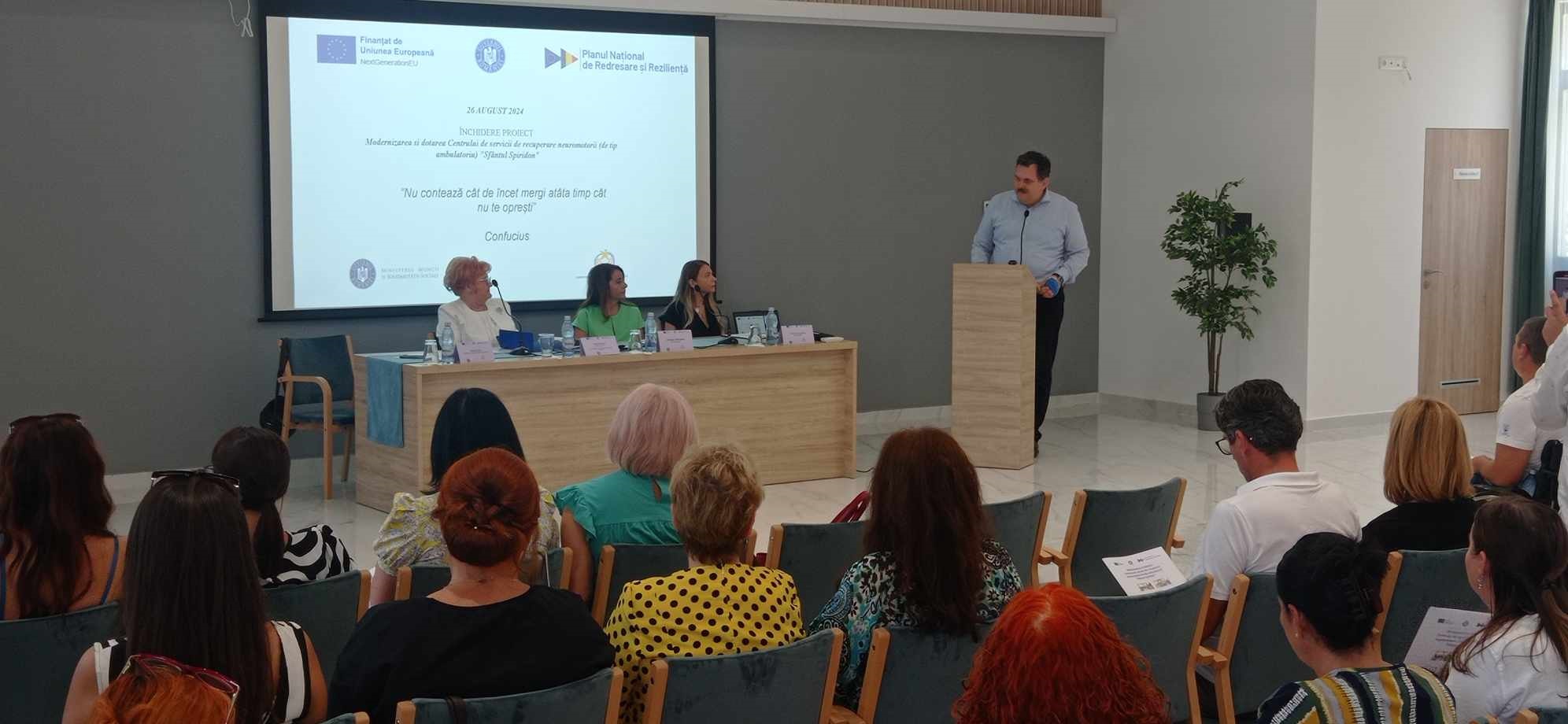 Conferința de închidere a proiectului de modernizare și dotare a centrului de servicii de recuperare neuromotorii ″Sfântul Spiridon″ din Satu Mare, un eveniment care marchează finalizarea cu succes a unui proiect de mare importanță pentru sănătatea sătmărenilor a avut loc luni, 26 august. Evenimentul s-a desfășurat la Centrul Spiritual "Casa Dăinuirii" în prezența directorului general al Agenției Națională pentru Plăți și Inspecție Socială, sătmăreanca Gabriela Opriș, a președintelui Consiliului Județean, Pataki Csaba, a directorului Direcției Generale de Asistență Socială și Protecția Copilului (DSASPC) a județului Satu Mare, Mariana Dragoș, a managerului de proiect, Ana-Adriana Văscan, a expertului de implementare, Katocz Zsuzsanna Marilena, precum și a altor invitați.