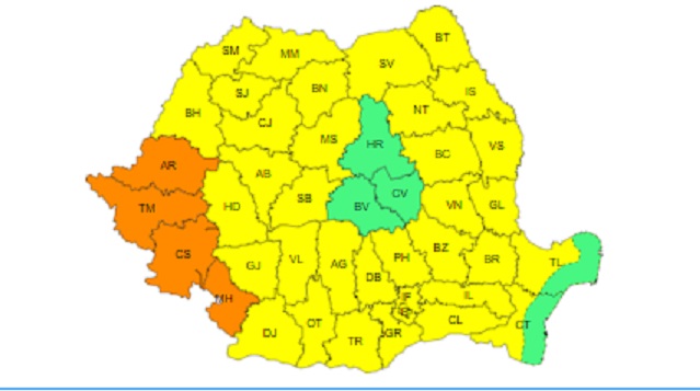 În județele Arad, Timiș, Caraș-Severin și Mehedinți canicula se va intensifica, disconfortul termic va fi accentuat, iar indicele temperatură-umezeală (ITU) va atinge pragul critic de 80 de unități. Temperaturile maxime, deosebit de ridicate pentru această dată, se vor situa în jurul a 37 de grade, iar minimele vor fi de 18...20 de grade, valori ușor mai mari, în jurul a 23 de grade, urmând a se înregistra în Dealurile de Vest”, spun meteorologii.