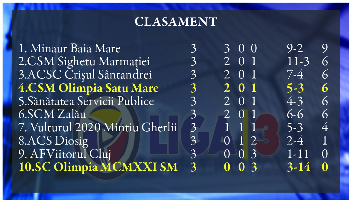Eșecul usturător din prima etapă, 1-9 la Sighet, poate fi pus și pe seama faptului că deplasarea în Maramureș a fost una cu peripeții. Cu autocar gripat la Certeze și apoi cu un drum continuat cu TAXI-uri până la destinație și oboseala acumulată… Apoi, acasă cu SCM Zalău, sălăjenii s-au impus cu 2-0 din două faze fixe dar jocul galben-albaștrilor a fost unul dătător de speranțe… Apoi a urmat meciul de la Baia Mare, unde Minaur a condus cu 2-0, iar sătmărenii au egalat în minutul 88… Doar că SC Olimpia a scăpat un punct printre degete după o deviere nefericită la un șut venit în ultimul minut…