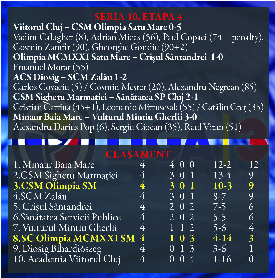 ACS Academia de Fotbal Viitorul Cluj – CSM Olimpia Satu Mare 0–5 (0–1) Marcatori: Vadim Calugher ’8, Adrian Micaş ’55, Paul Copaci ’75 (din penalty), Cosmin Zamfir ’90, Gheorghe Gondiu ’90+3. Viitorul Cluj Napoca: Checicheș- Milandru, Harfaș, Poenar, Istrate, Pop Bogdan, Bara, Zanc, Maxim, Cozac, Herciu. CSM Olimpia: Bogdan Miron – Dorian Todoran, Csatári Márk, Cătălin Oanea (’72, Paul Copaci), Emanuel Negru, Vadim Calugher (’79, Abdul Wahab Adam), Adrian Micaş, Viorel Chinde (’72, Marius Hosu), Samuel Şanta (’67, Răzvan Săutiuț), Mamourou Sonogo (’67, Gheorghe Gondiu), Cosmin Zamfir.